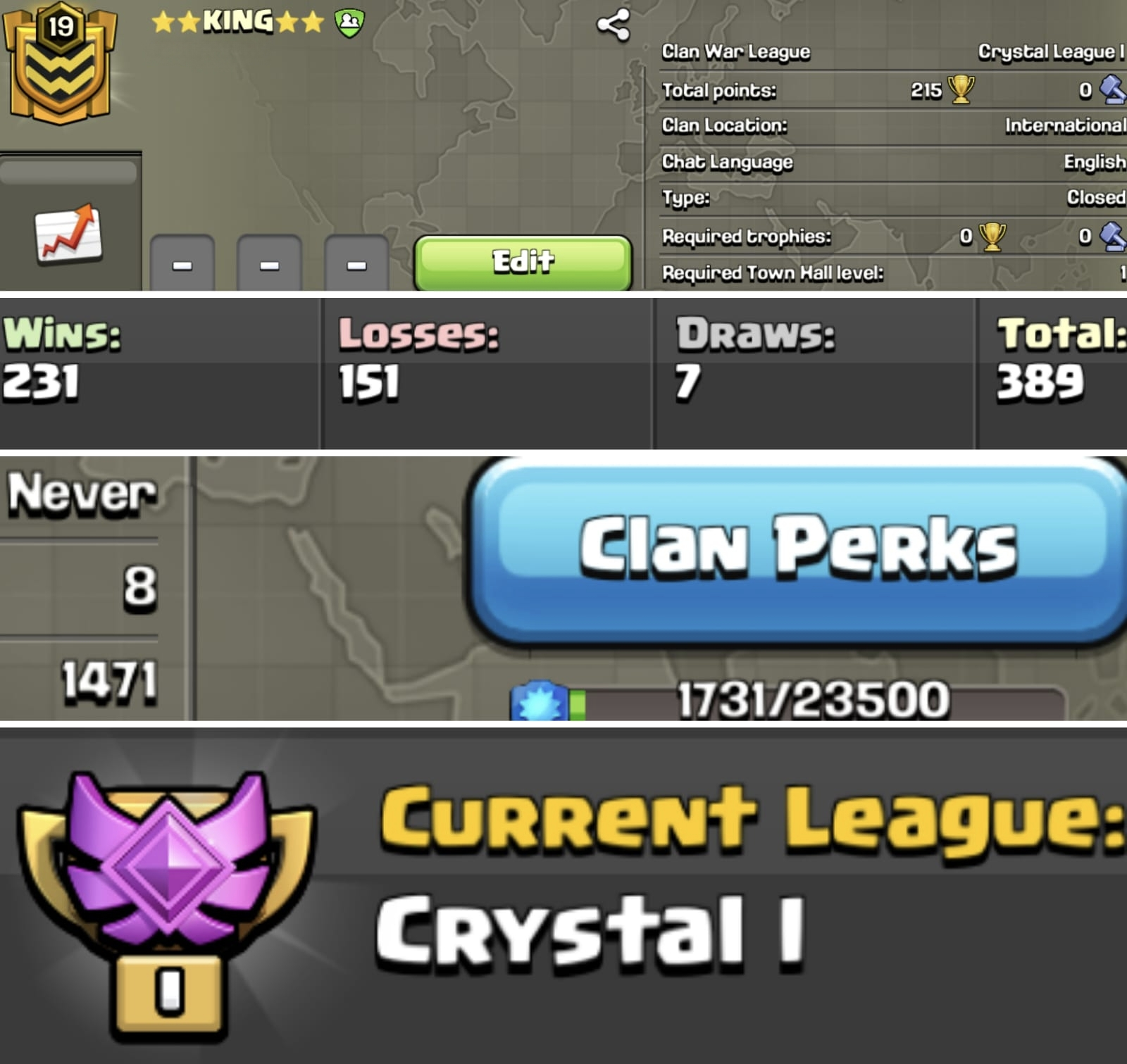 Lvl 19 - * KING * | Clan Capital 8 | War Log { 231 : 151 } | CWL : Crystal 1 | Instant Delivery unless sleeping