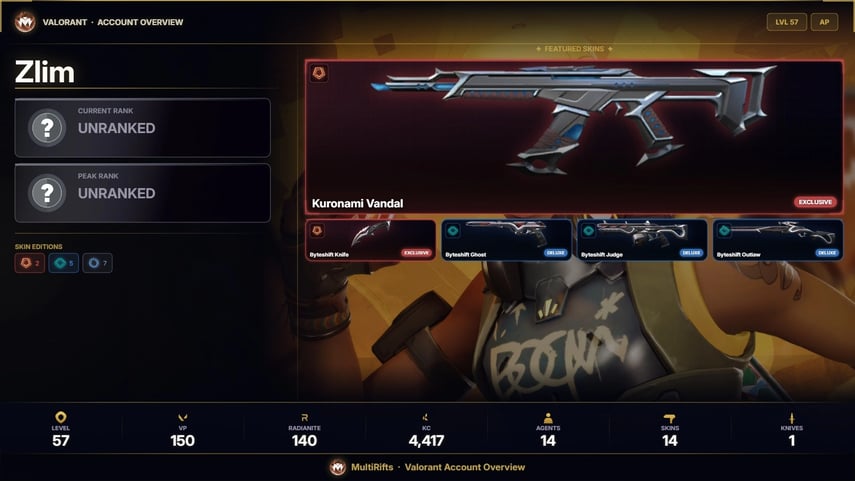 🎯 【AP】 ⸱ 🌟 LVL 57 ⸱ 🛡️ Unranked | 🌈 14 Skins ⸱ [ 💰 150 VP , 140 RD ] ⸱ ⭐ Byteshift Bundle (5) ⸱ Doom Wing Bundle (4) ⸱ 🚀 Ready2Smurf 😈