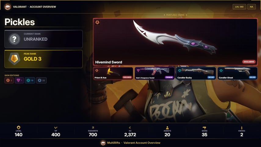 🎯 【NA】 ⸱ 🚀 LVL 140 ⸱ 🏆 Unranked (Peak: GOLD 3) | 🎨 35 Skins ⸱ [ 💸 400 VP , 700 RD ] ⸱ 🌟 Prism Iii Bundle (4) ⸱ 🚀 Ready2Smurf 😈