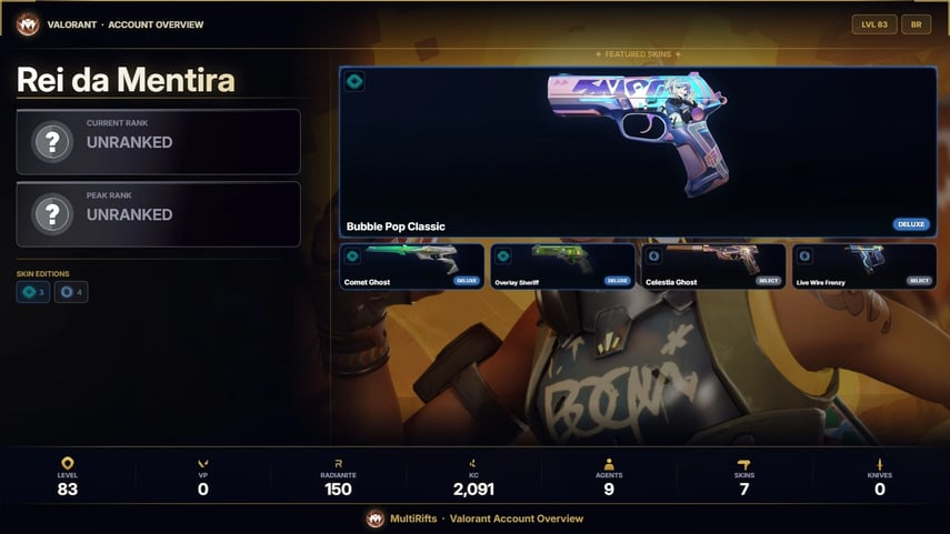 🎯 【BR】 ⸱ 🏆 LVL 83 ⸱ 🎖️ Unranked | 🖌️ 7 Skins ⸱ [ 💸 0 VP , 150 RD ] ⸱ 🌟 BUBBLE POP ⸱ COMET GHOST ⸱ OVERLAY SHERIFF ⸱ 🚀 Ready2Smurf 🔓
