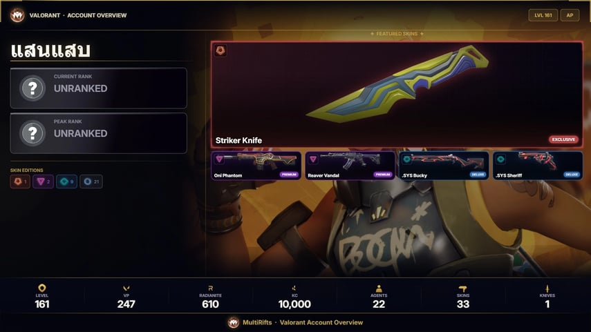 🕹️ 【AP】 ⸱ ✨ LVL 161 ⸱ 🏆 Unranked | 🎨 33 Skins ⸱ [ 💰 247 VP , 610 RD ] ⸱ 🌟 Striker Bundle (5) ⸱ Lycan's Bane Bundle (4) ⸱ 🚀 Ready2Smurf 🎉