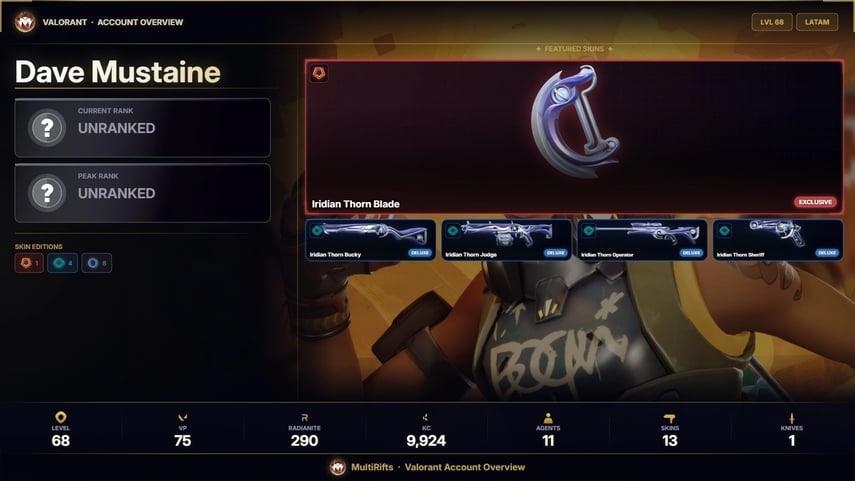 🔫 【LATAM】 ⸱ ⚡ LVL 68 ⸱ 🛡️ Unranked | 🖌️ 13 Skins ⸱ [ 🪙 75 VP , 290 RD ] ⸱ ⭐ Iridian Thorn Bundle (5) ⸱ Iridian Bundle (5) ⸱ 😈 Ready2Smurf ⚡