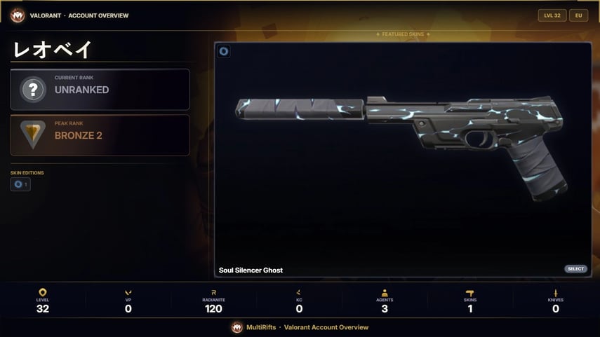 🎯 【EU】 ⸱ 🌟 LVL 34 ⸱ 🛡️ Unranked (Peak: GOLD 3) | ✨ 0 Skins ⸱ [ 🪙 0 VP , 120 RD ] ⸱ 🎉 Ready2Smurf 🚀