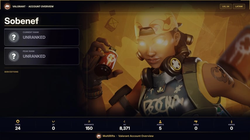🕹️ 【LATAM】 ⸱ 🏆 LVL 24 ⸱ 🎖️ Unranked | 💎 0 Skins ⸱ [ 💸 0 VP , 150 RD ] ⸱ 🎉 Ready2Smurf 🔓