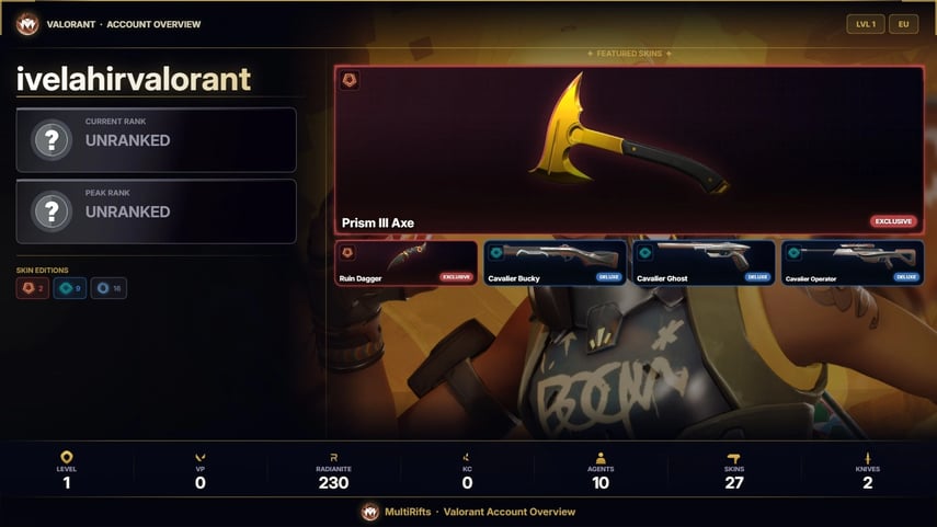 🎮 【EU】 ⸱ 🎯 LVL 1 ⸱ 🏆 Unranked | 💎 27 Skins ⸱ [ 💸 0 VP , 230 RD ] ⸱ ✨ ★ RUIN DAGGER ⸱ Prism Iii Bundle (4) ⸱ 🎉 Ready2Smurf 😈