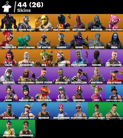 🎮 [PC/Xbox/PS] 🎯 44 Skins | ⚡ Omega (Stage 5) | 🕶️ Rogue Agent | 🦖 Tricera Ops | 🔥 Valor | 👮 Enforcer | 🌪️ Drift | 🐟 Moisty Merman | 🦖 Rex | 💘 Love Ranger | 🤖 Carbide | 🔴 Red Knight | 💰 100 V-Bucks 🚀