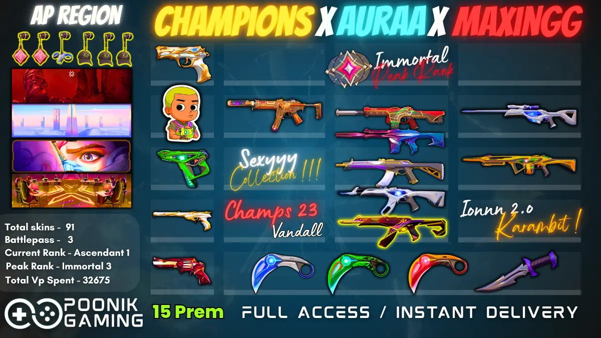 🎯 91 SKINS ⸱ AP REGION | 📹 VIDEO: imgur.com/a/i8pM152 | IMMORTAL PEAK, CHAMPIONS 2023 VANDAL, REAVER, SINGULARITY, ION & MORE! [V668]