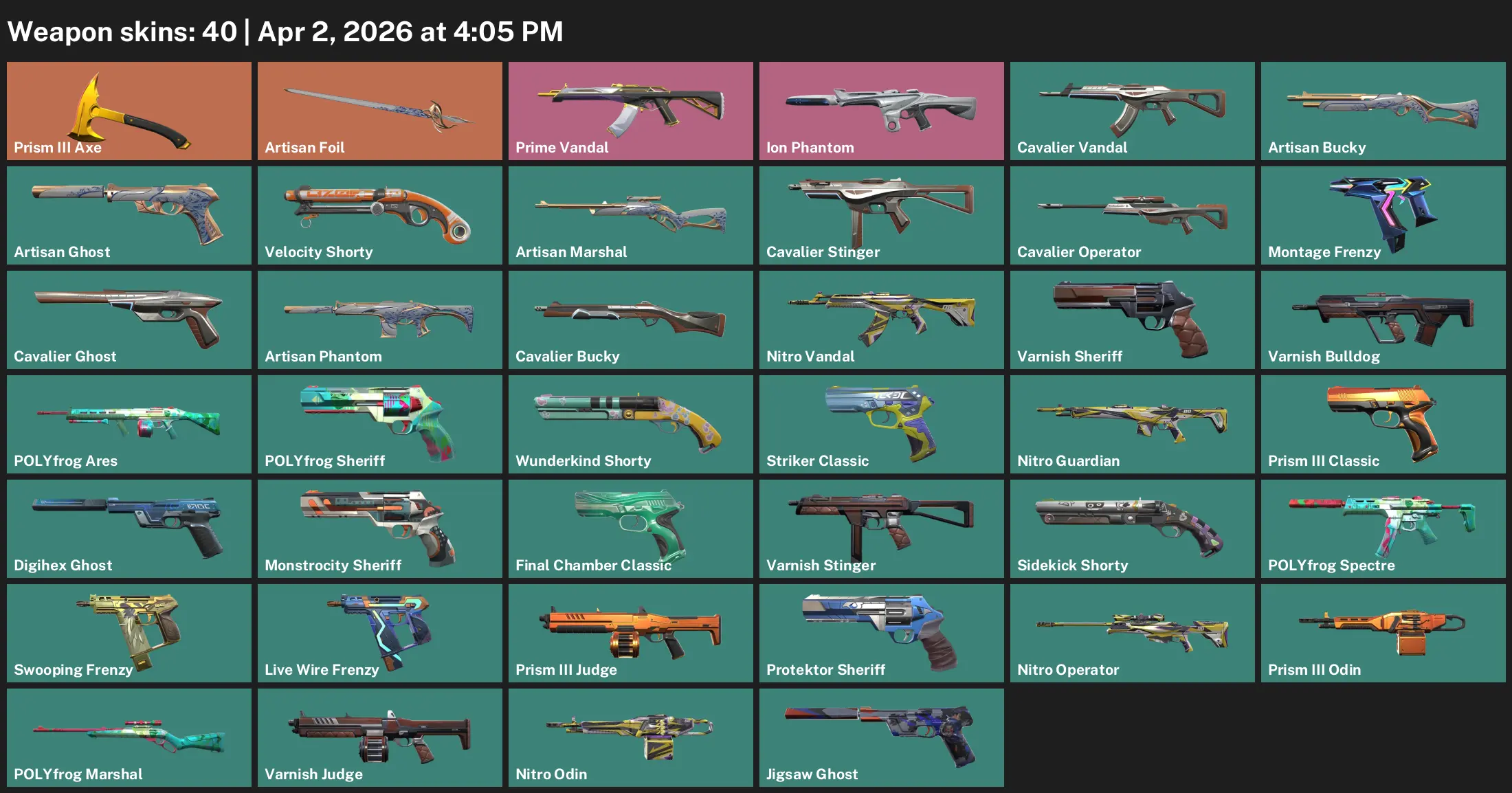 AP | 40 Skins | exp DIAMOND 1 | Prism III Axe | Prime Vandal | Ion Phantom | Artisan Foil | Nitro Vandal | Artisan Phantom | #KCG8534