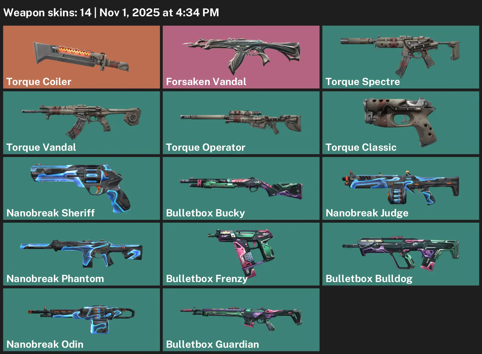 🥑 AP ⛽️ Unranked 📚 14 Skins 🌂 772 VP 🤧 6 Agents 🐻❄️ Value: 1775 VP ☹️ Torque Coiler 🌁 Forsaken Vandal 🫷 Torque Spectre 🙉 Torque Vandal 🌬 Torque Operator 🧊 Torque Classic