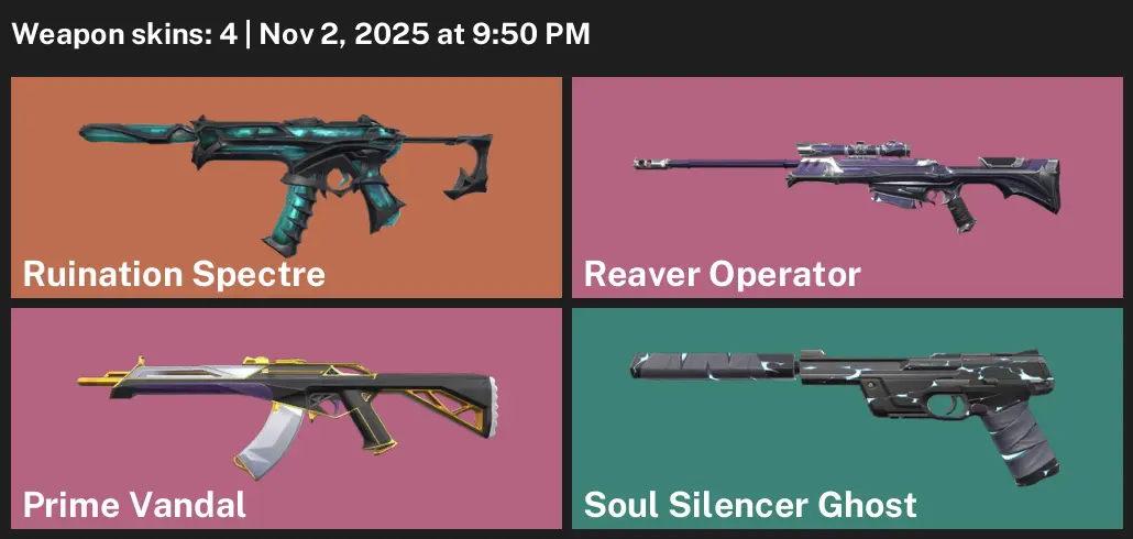 🔎 AP 📫 Unranked 🪤 4 Skins 🙊 79 VP 🧾 14 Agents 🎨 Value: 5725 VP 🦮 Ruination Spectre 🧻 Reaver Operator 🏢 Prime Vandal ⛹️♂️ Soul Silencer Ghost
