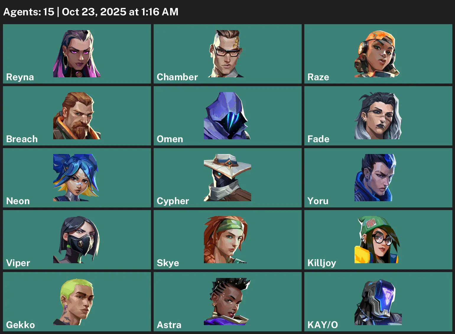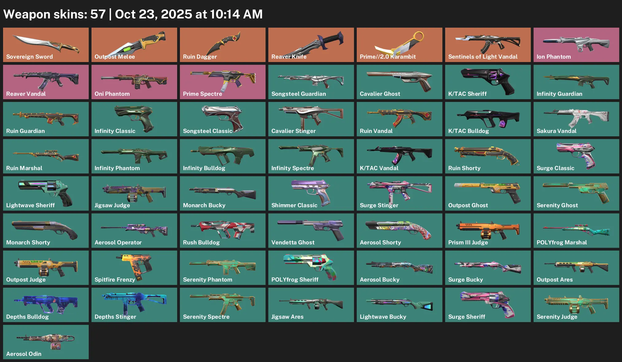 💍 AP 🌡 Unranked 🚘 57 Skins 🥱 232 VP 🤮 15 Agents ☹️ Value: 22075 VP 🦇 Sovereign Sword 😲 Outpost Melee 🎞 Ruin Dagger 🫧 Reaver Knife 🪵 Prime//2.0 Karambit 🪔 Sentinels of Light Vandal