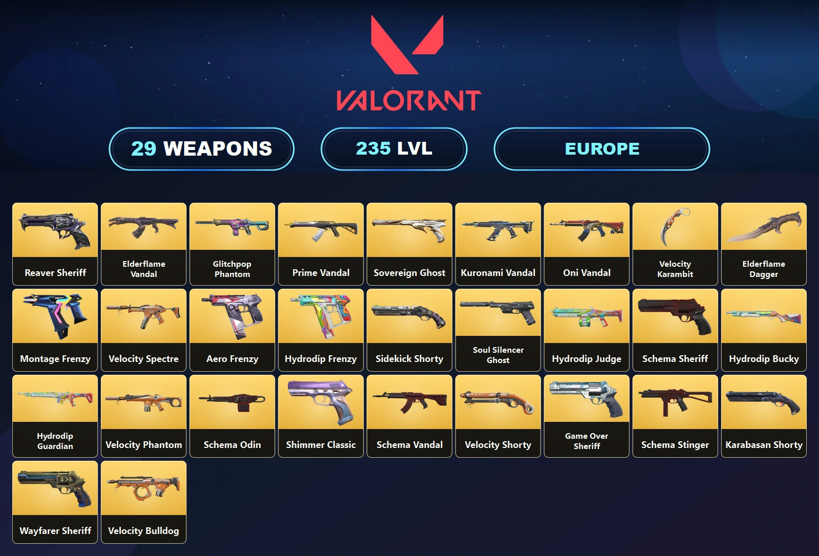 EU 🥪 29 Skins 🍒 235 Level 🔥 Kuronami Vandal 👚 Elderflame Vandal ⛱ Prime Vandal 🏁 Oni Vandal 🧊 Glitchpop Phantom 💠 Elderflame Dagger 🎲 Reaver Sheriff 🍋 Platinum 1 👢 23 Agents