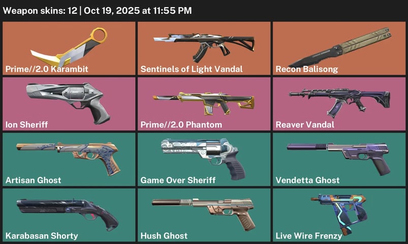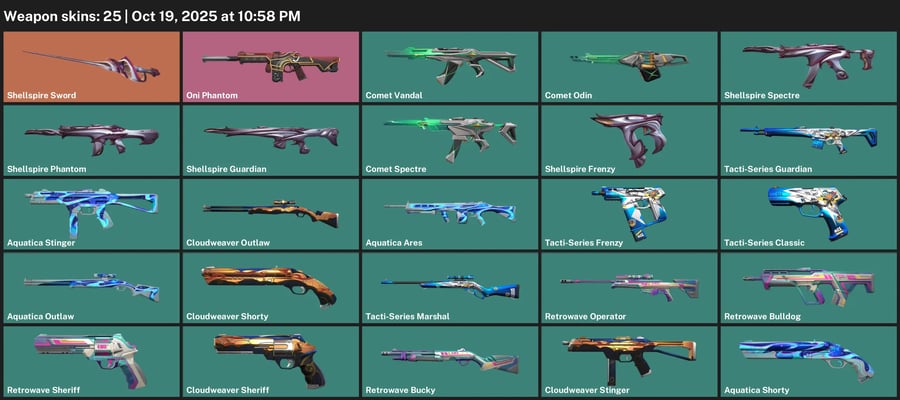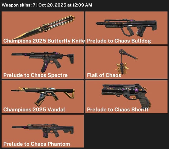 🌖 EU 🥍 Unranked 💿 11 Skins 🫗 545 VP 🔗 5 Agents 🦙 Value: 5725 VP 🍩 Gaia's Fury 🚣 Sentinels of Light Vandal 🥁 Torque Spectre ✊ Torque Classic 🏣 Torque Operator 😰 Bulletbox Bucky