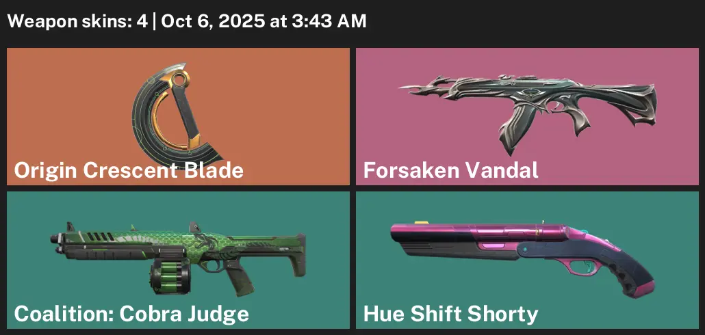 EU | Unranked | Inventory Value 5325 VP | 4 Skins | Origin Crescent Blade | Forsaken Vandal | Coalition: Cobra Judge | Hue Shift Shorty | Full Access #6380
