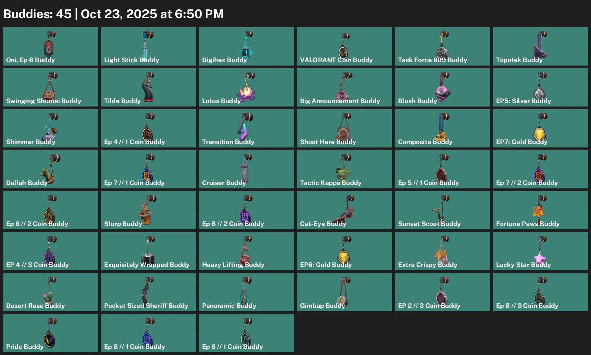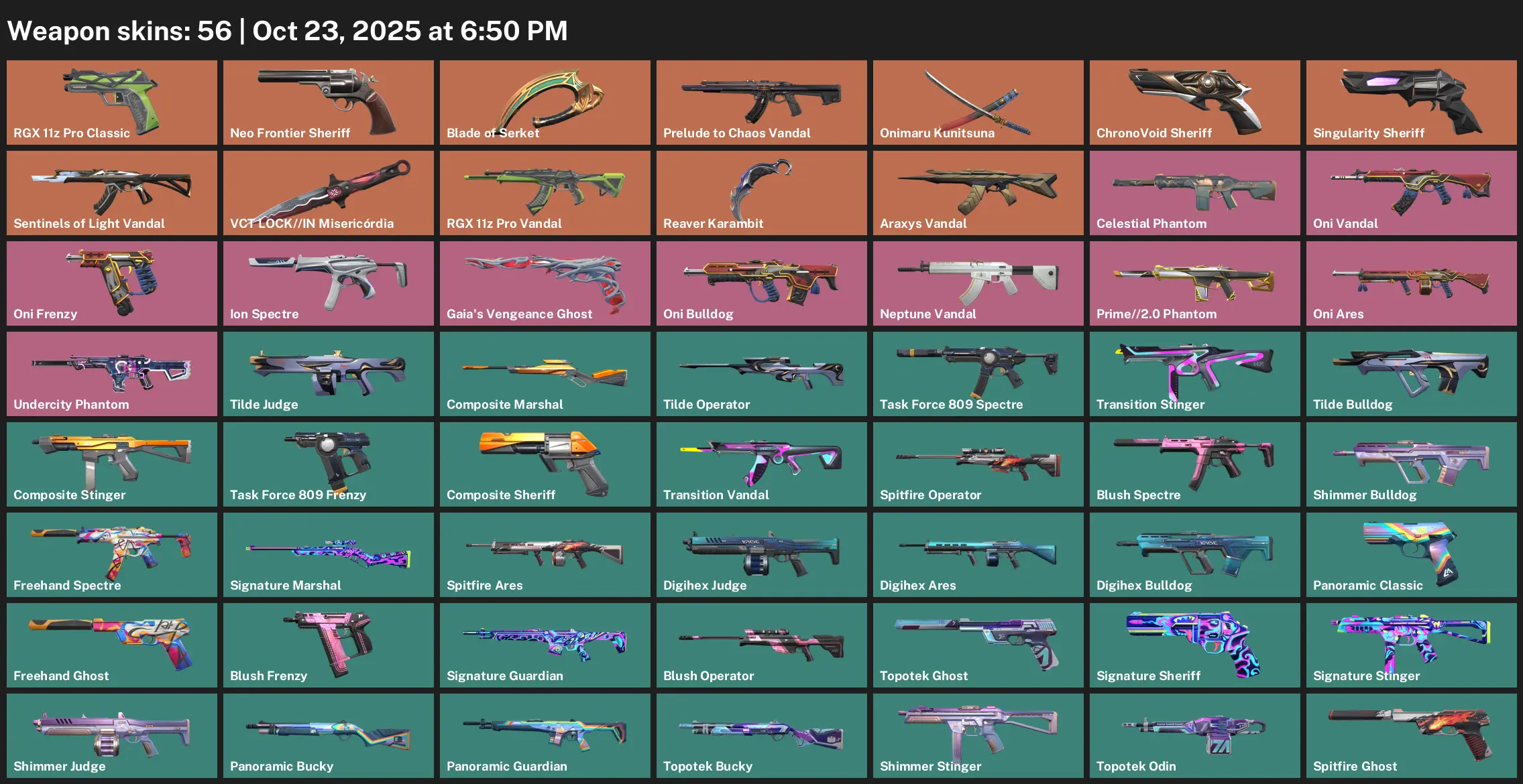 😨 LA 🦫 Unranked 🛌 56 Skins 🏨 635 VP 🥱 23 Agents 🍱 Value: 52840 VP 🫨 RGX 11z Pro Classic 🥞 Neo Frontier Sheriff 🖌 Blade of Serket 🔐 Prelude to Chaos Vandal 🤢 Onimaru Kunitsuna 🌕 ChronoVoid Sheriff