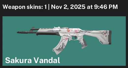 🚢 NA ⛪️ Unranked 🐑 1 Skins 🤐 775 VP 👍 1 Agents 🍉 Value: 1275 VP 🔌 Sakura Vandal