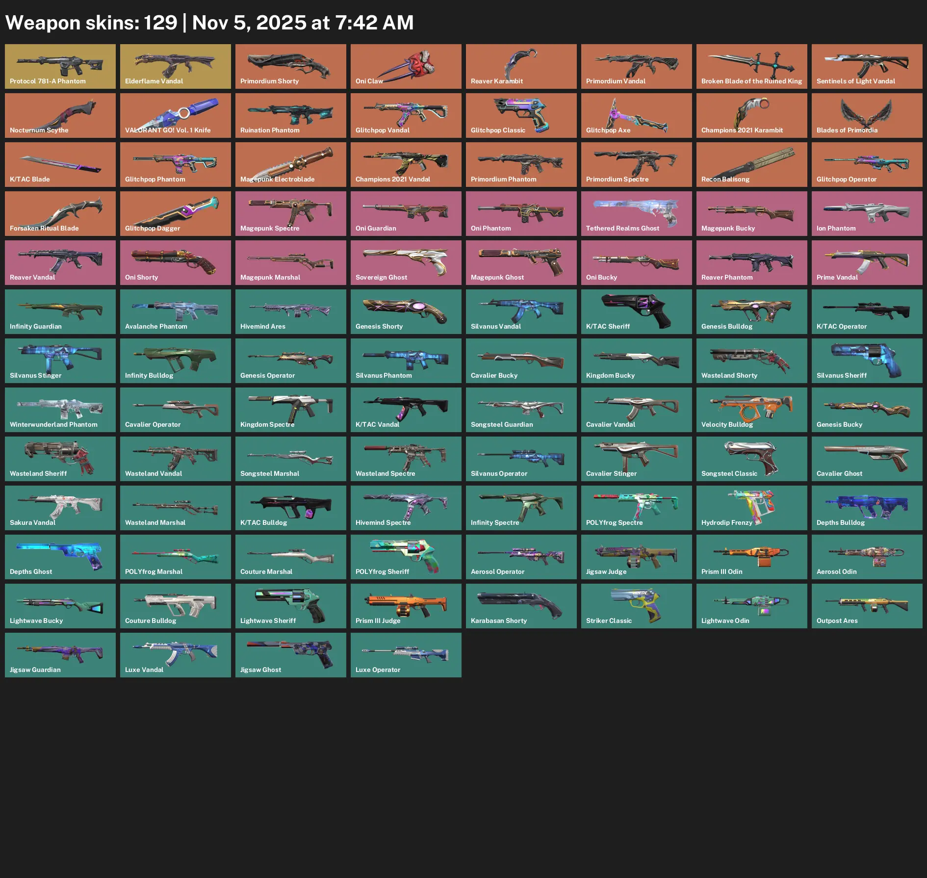 🪙 NA 🥂 Unranked 🔐 129 Skins 🦣 77 VP 🪼 21 Agents 🚃 Value: 122750 VP 🪜 Protocol 781-A Phantom 🩸 Elderflame Vandal 🚢 Primordium Shorty 🌈 Oni Claw 🦕 Reaver Karambit ☂️ Primordium Vandal