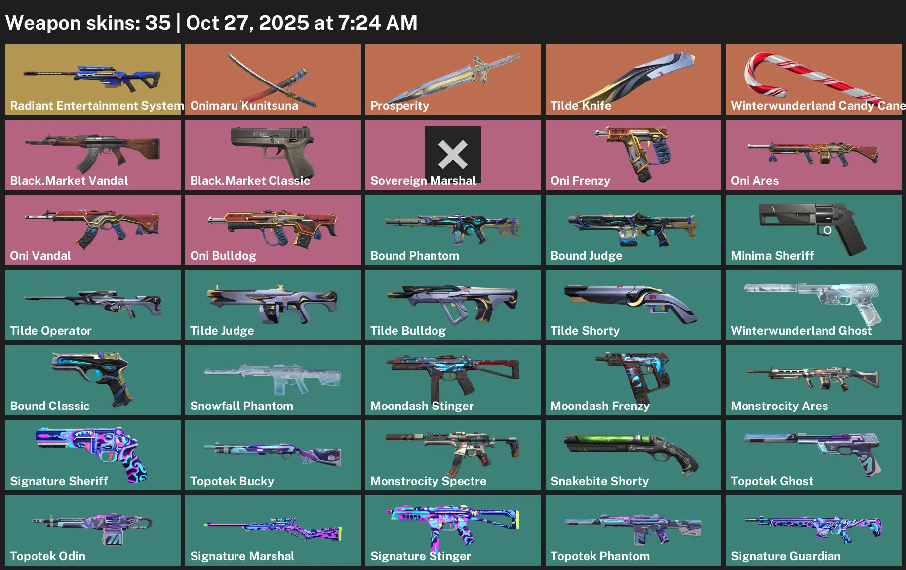 👍 NA 🛼 Unranked ⚖️ 35 Skins 🧥 781 VP 🍤 9 Agents ⛺️ Value: 30675 VP 🤼 Radiant Entertainment System Operator 🏩 Onimaru Kunitsuna 🐾 Prosperity 🦓 Tilde Knife 🚴♀️ Winterwunderland Candy Cane 🌮 Black.Market Vandal