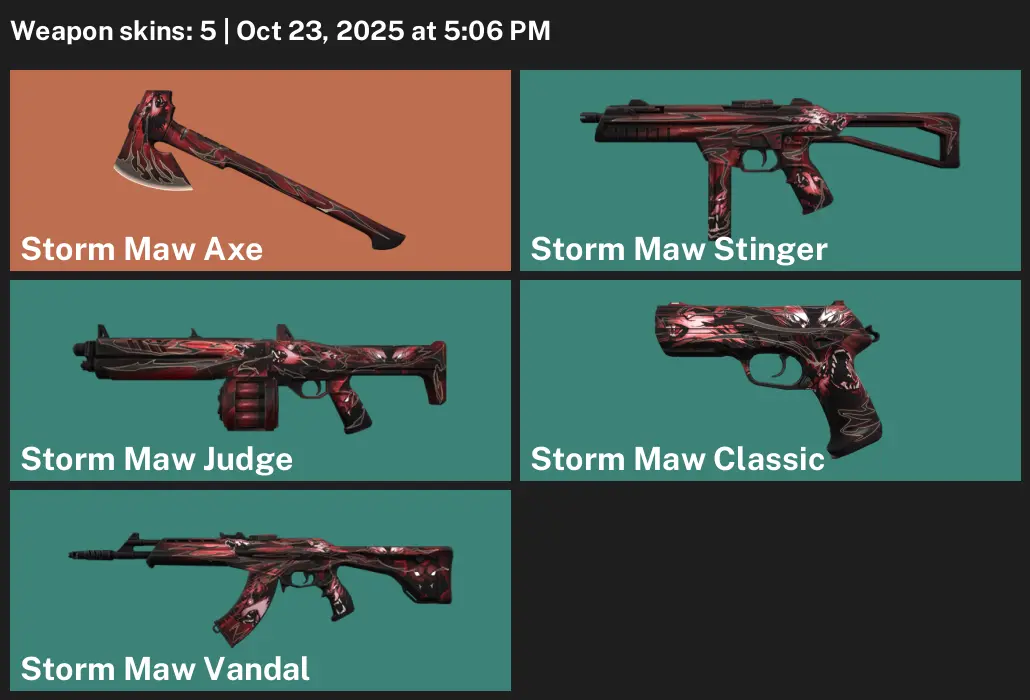 🐚 NA 👖 Unranked 🧩 5 Skins 👻 150 VP 🛕 1 Agents 🖋 Value: 5250 VP 🌗 Storm Maw Axe 🦓 Storm Maw Stinger 🌅 Storm Maw Judge 🩼 Storm Maw Classic 🫕 Storm Maw Vandal