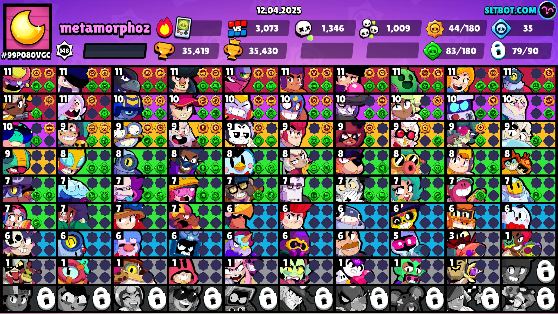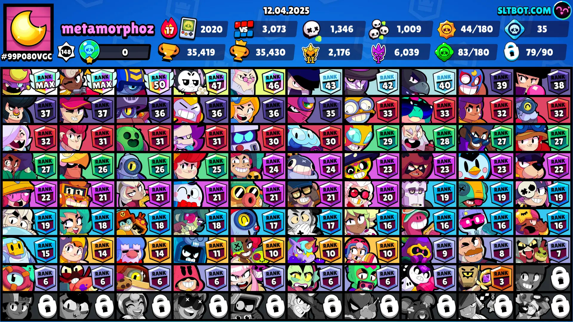 109 SKINS 🩵 35.419 TROPHIES 🏆 79 BRAWLERS 🧸 10 HYPERCHARGED 🩸 12 MAX BRAWLERS 🩷 HEBI KENJI 🩵 ROGUE MORTIS 🩵 SANTA STU 🩵 MOON-CURSER PENNY 🩵 DARK LORD SPIKE 🩵 PIANO 8-BIT 🎀