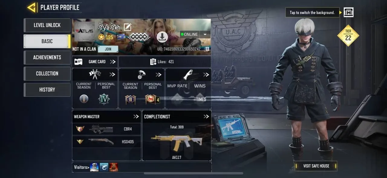 iOS Android 🎮 Level 195 🎯 Rank Grand Master 🛍️ 1 Mytich ♥️ Legendary 4 💫 Epic 104 🏆 57 Epic Soldier ✅ Code576