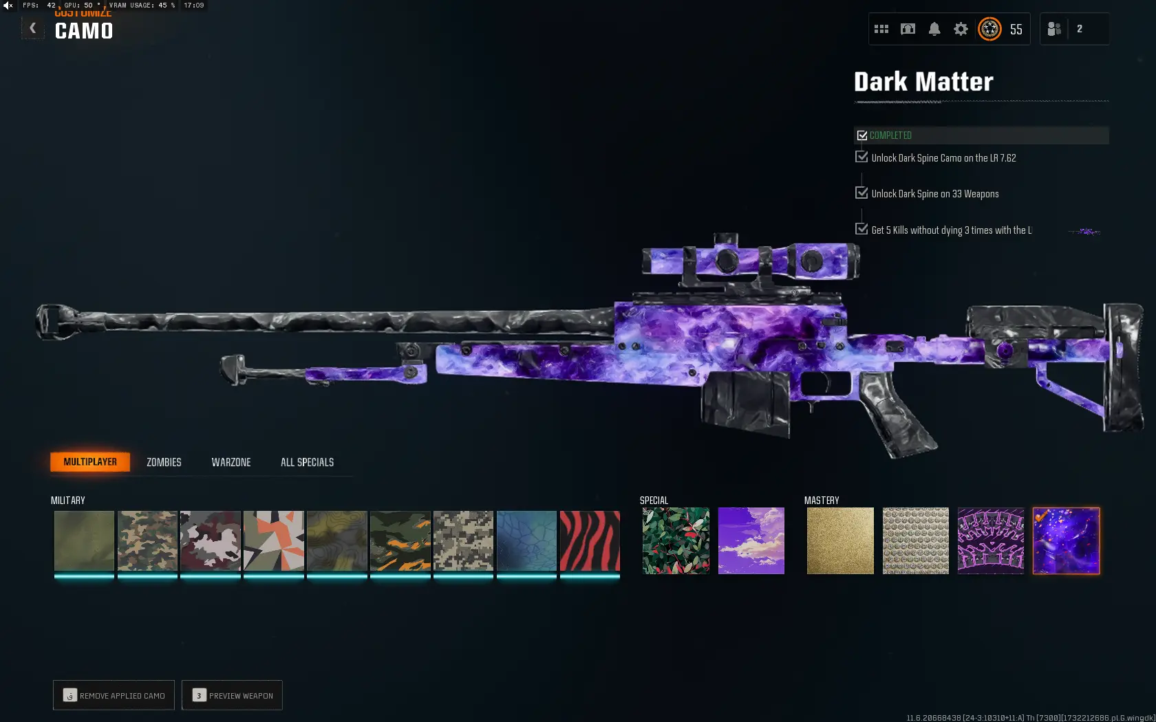 Dark Matter on all 33 BO6 guns 🦅 Prestige 1 • Level 55 🎼 Diamond camo unlocked 🧊 Dark Spine camo 🌙 Gold camo for 33 📀 Linkable STEAM • BNET • XBOX • PSN 🎩 Full Access 🔥 Instant Transfer 🕹️