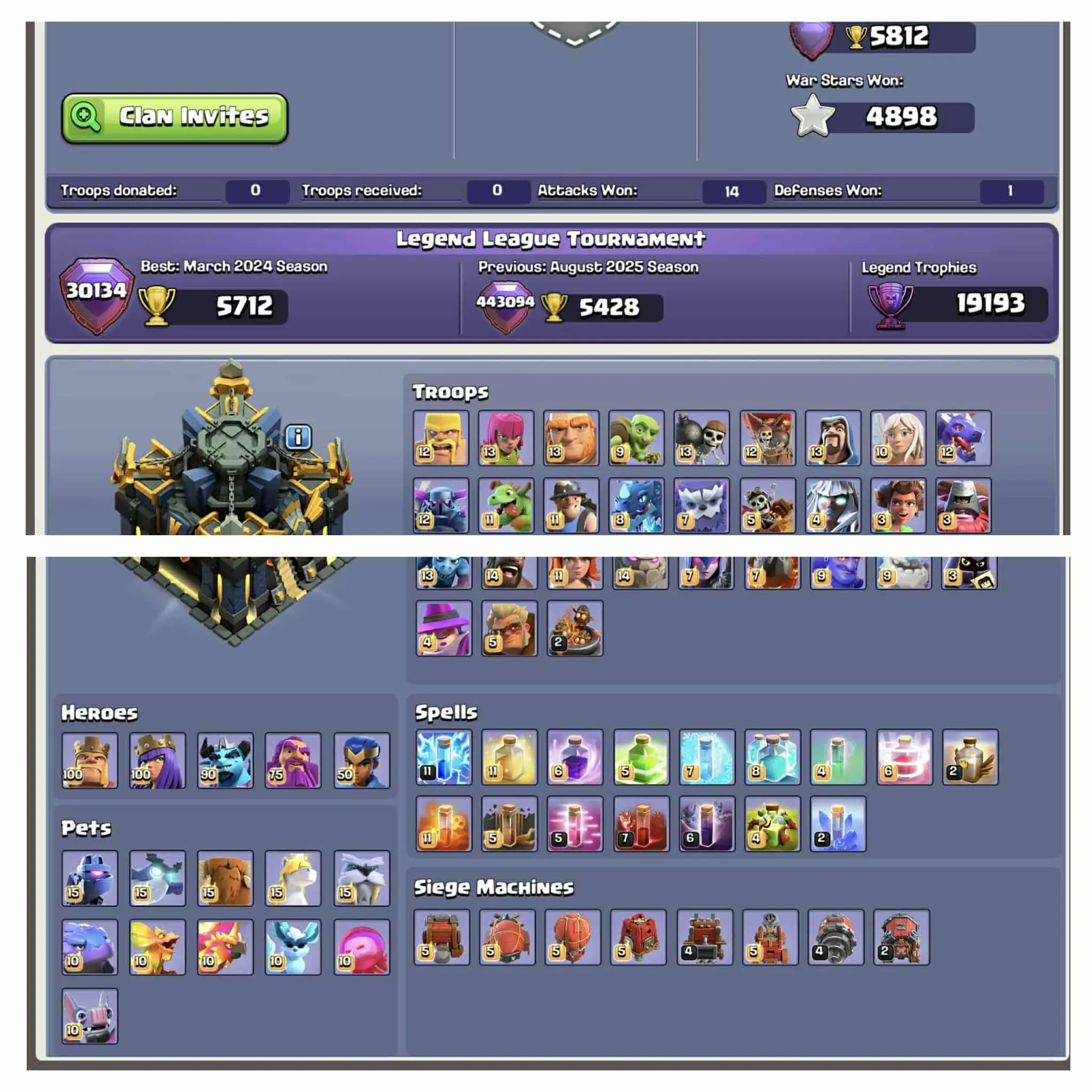 Level 262🌹TH 17 Max🌹7 Epic Equipments Maxed🌹Almost 5k WarStars🌹Heroes/Pets/Walls/defense Maxed