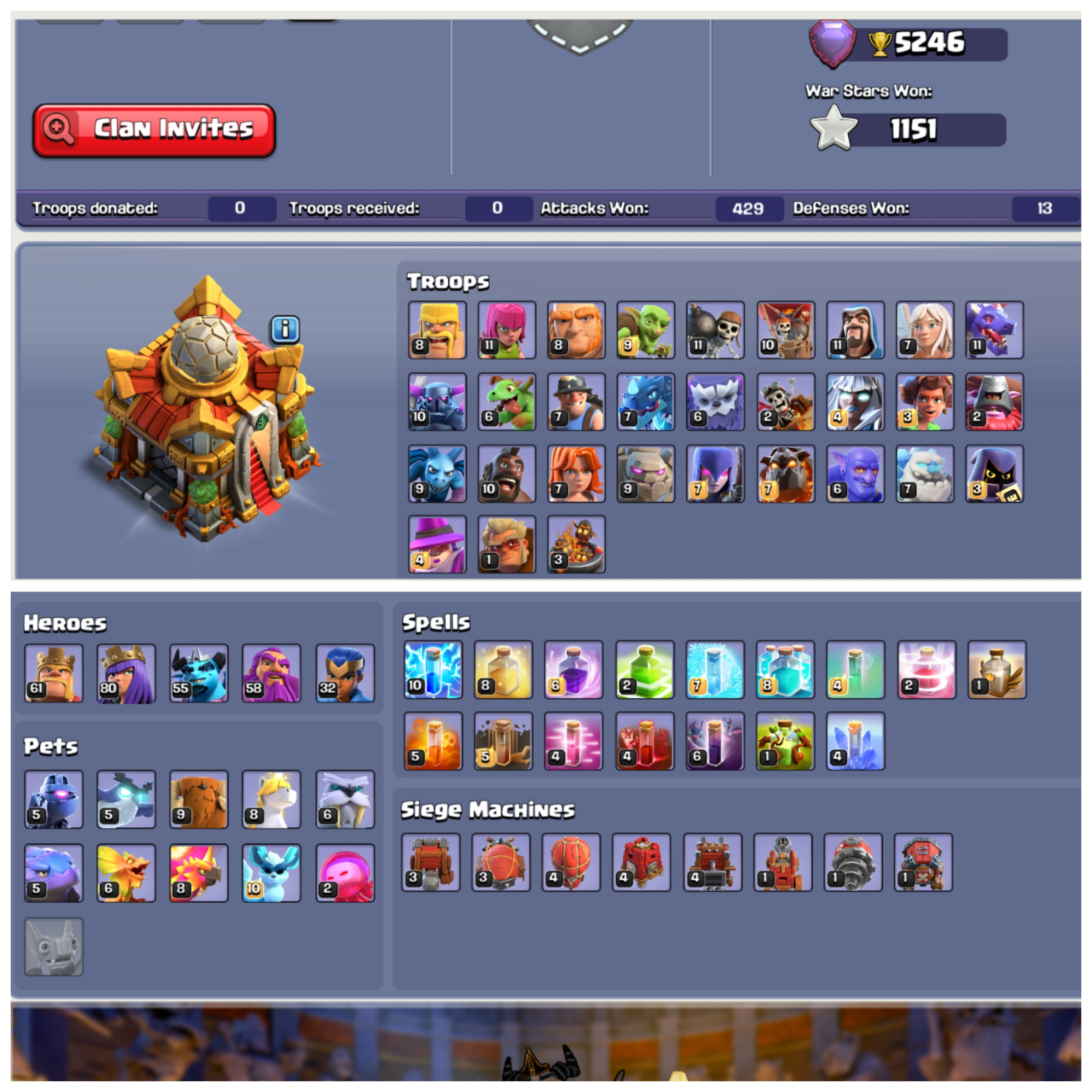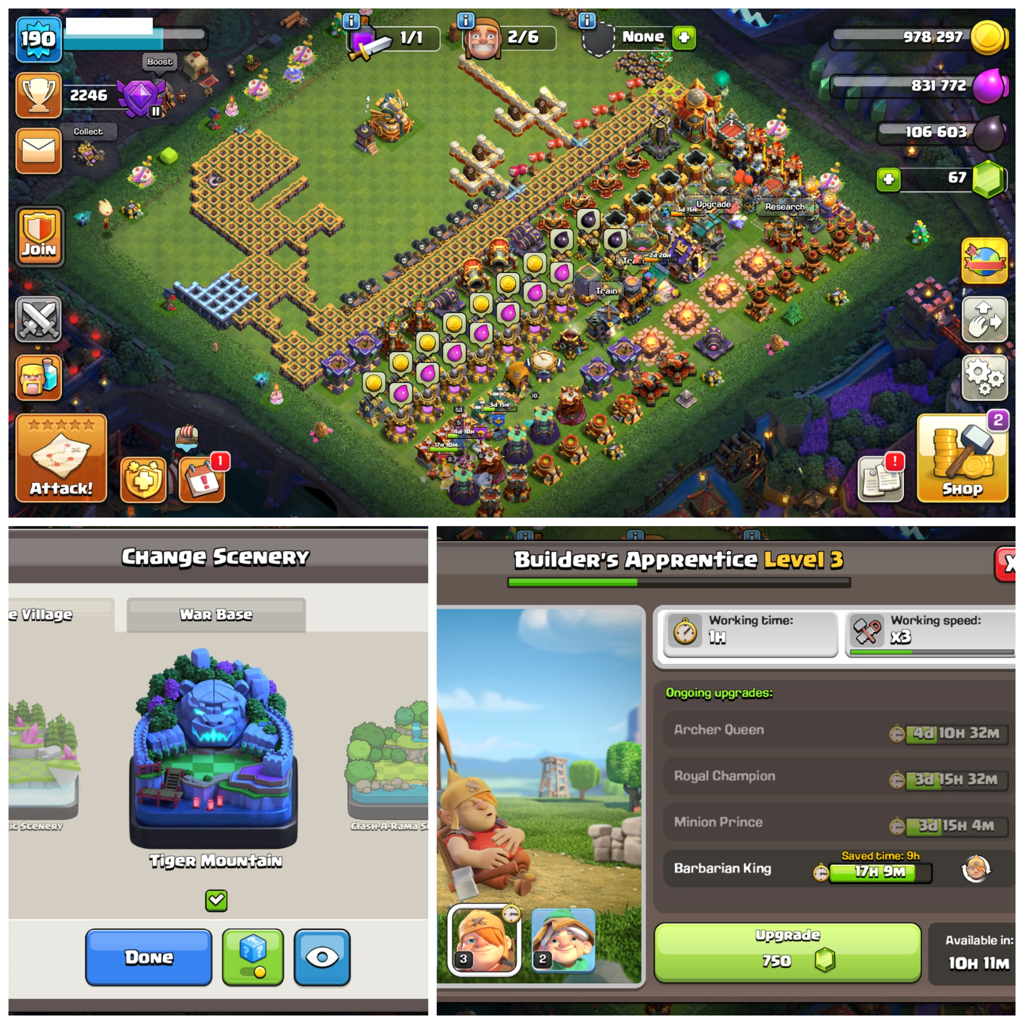 ⚡ TH 16 OG Pearl 🐅 Tiger Mountain Scenery 🛡️ Heroes: BK61 AQ80 MP55 GW58 RC32 💎 10 Epic Equipments (Very High Levels) 🔨 Level 3 Apprentice 🚀 Instant Delivery