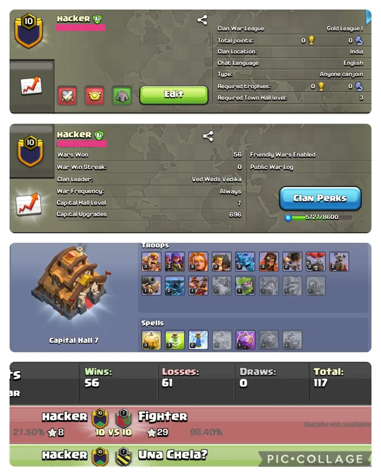 [CC 7 + GOLD 1 ] đNAME : HACKER đ„¶ LEVEL : 10.5 âïž WARLOG W-L-D : 56-61-0