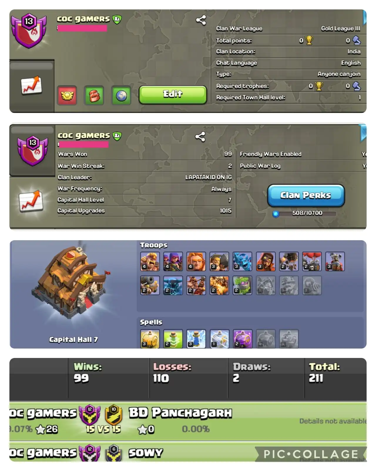 đ„ [ GOLD 2 + CC7 ] đNAME : COC GAMERS đ„¶ LEVEL : 13 âïž WARLOG W-L-D : 99-110-2 đ