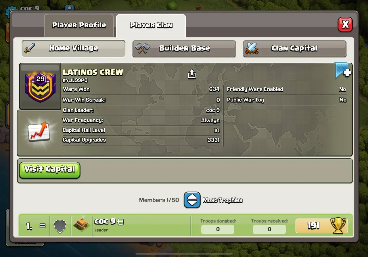 LATINOS CREW 💎 LEVEL:29 💎 CAPITAL HALL:10 💎 WAR WON:634 💎 CWL:MASTER 3