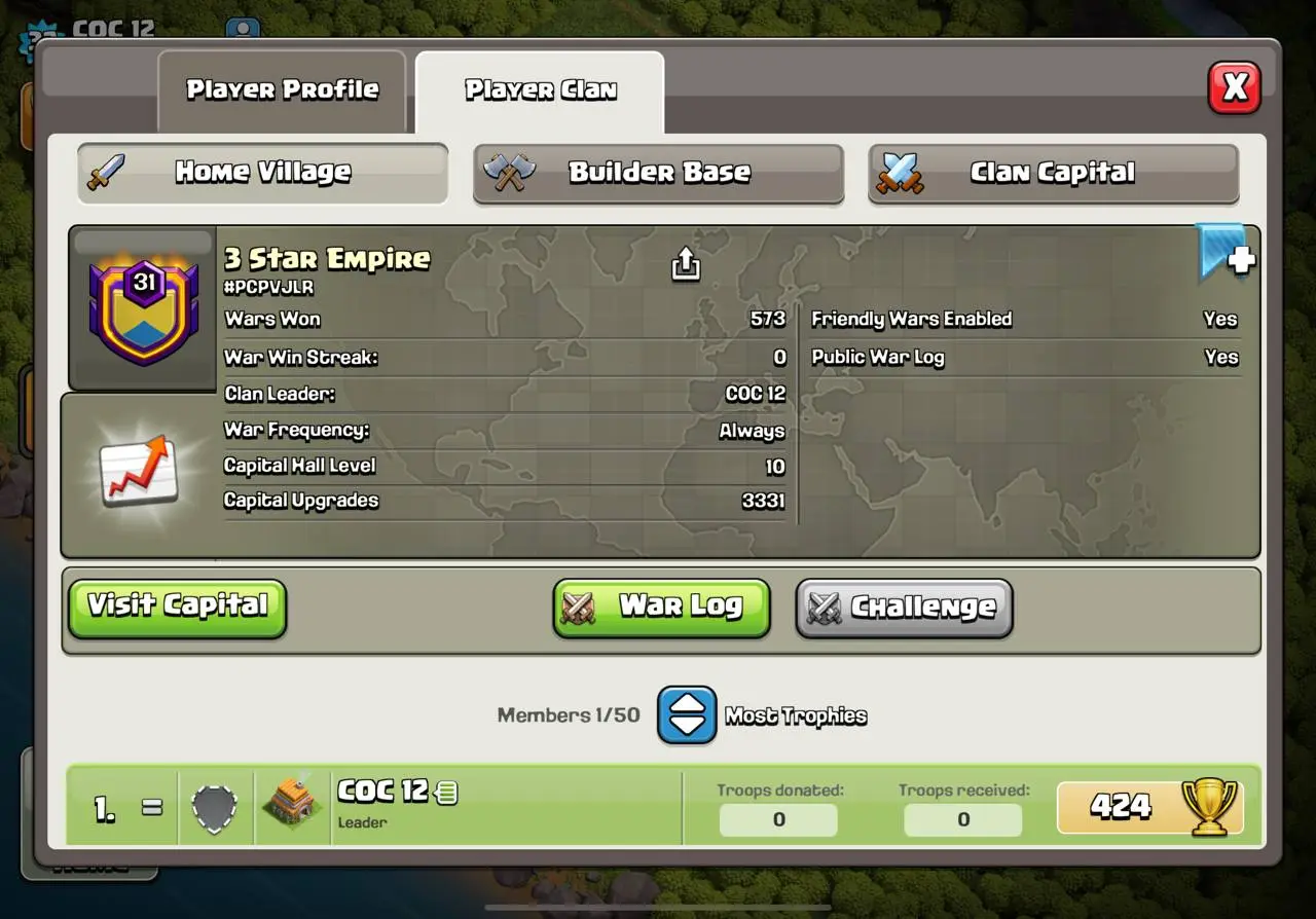 [] NAME:Brother's [] LEVEL:18 [] CAPITAL HALL:5 [] WAR WON: 239 / 89 [] CWL: CRESTAL 1