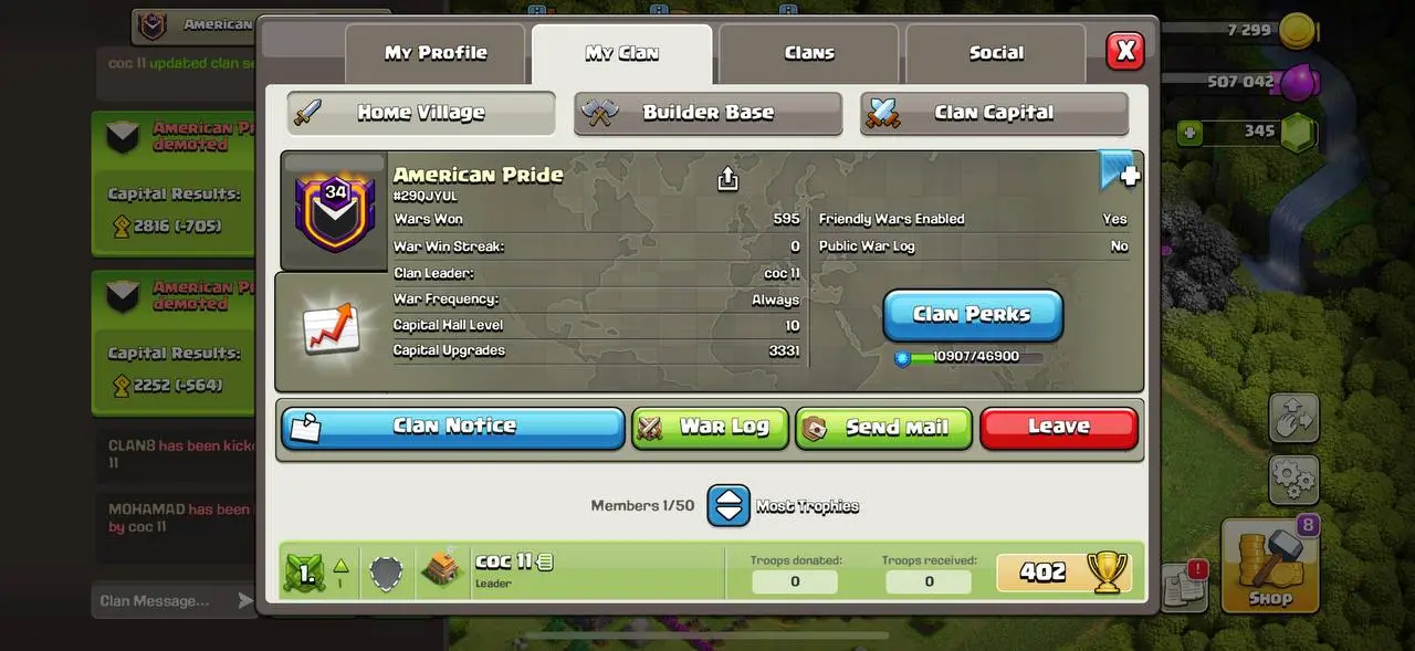 AMERICAN PRIDE 💎 LEVEL:34 💎 CAPITAL HALL:10 💎 WAR WON:595 💎 CWL:MASTER 3