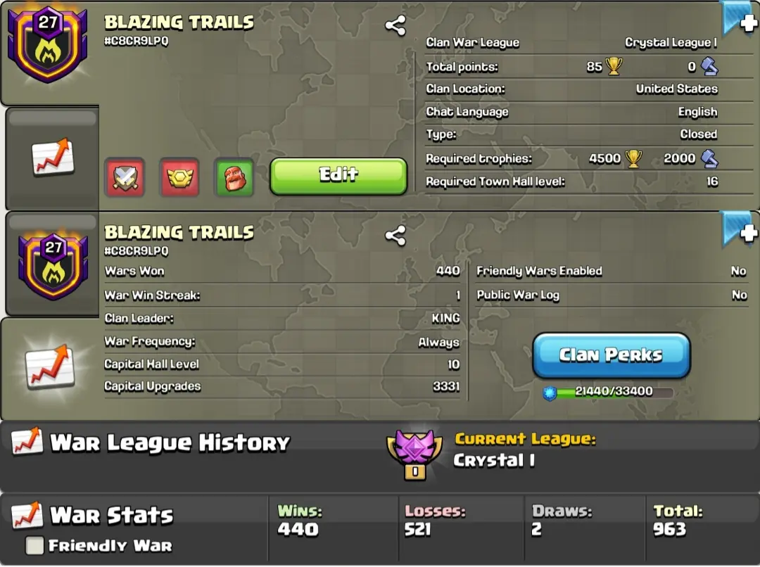 Level 27 Clan đ„ Blazing Trails Name đ© Max Capital Peak đ Instant Delivery Unless Sleeping