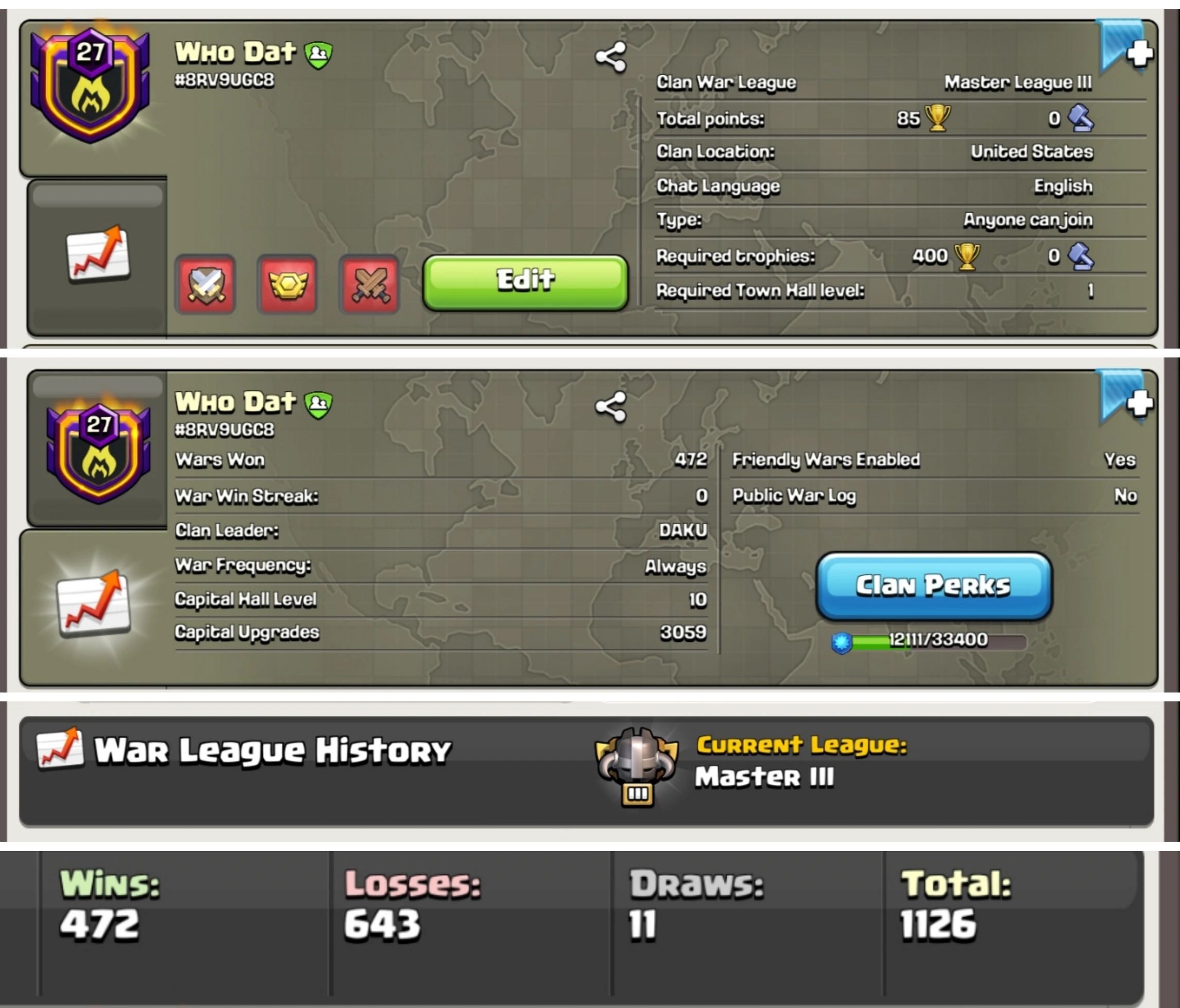 Rare Level 27 Clan đĄïž "Who Dat" âïž Master III League đïž Capital Peak 10 đ° USA Based đșđž Instant Delivery âĄ