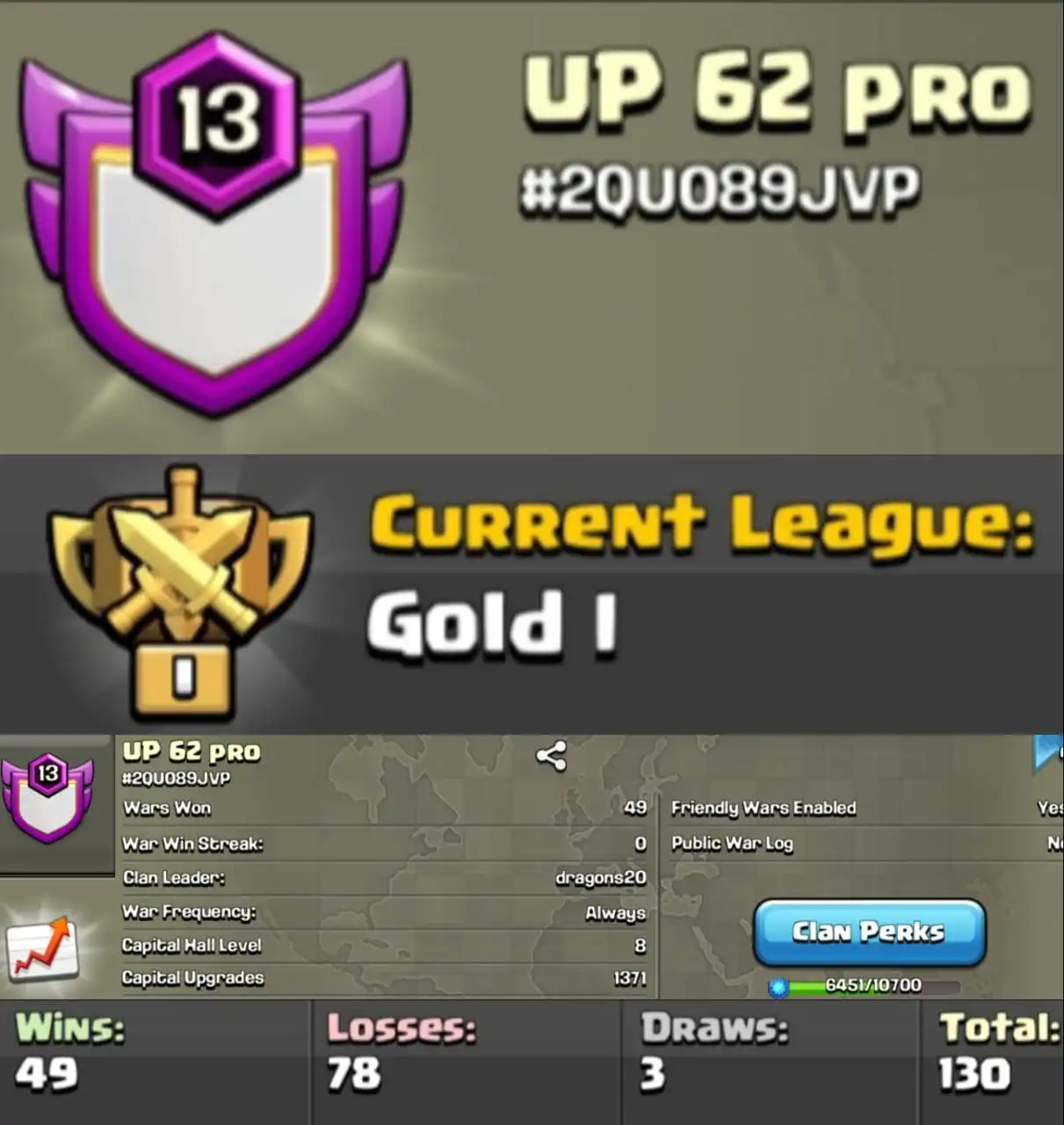 Level 13 clan || clan capital 8 || gold 1 || name - UP 62 PRO