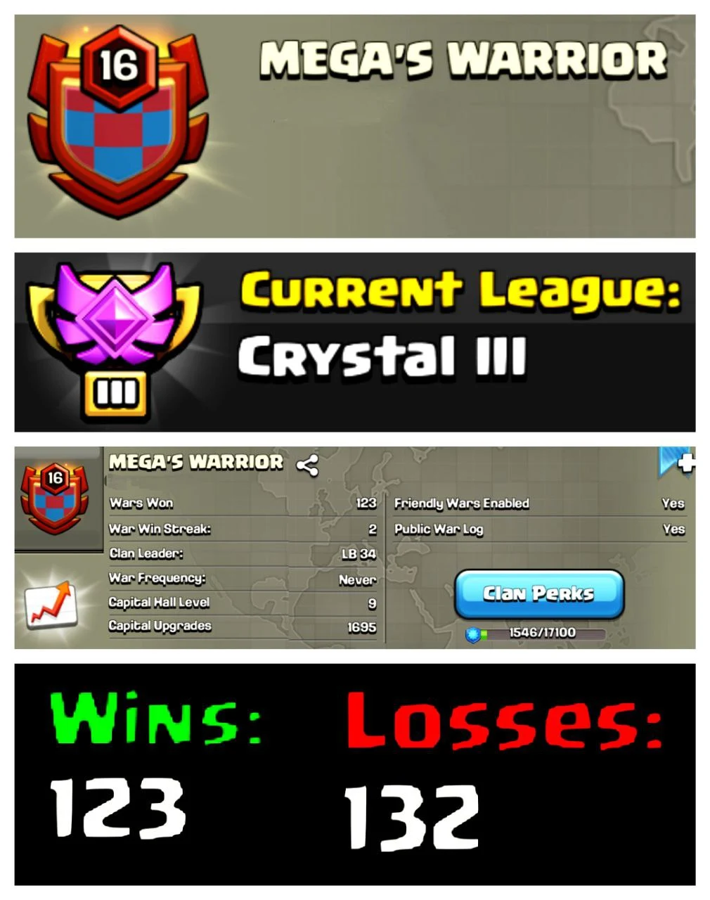❣OP LEVEL 16 ENGLISH CLAN ✳️ OP NAME : MEGA'S WARRIOR ✅LEAGUE : CRYSTAL 3♻️ CLAN CAPITAL : 9♥️WINS : 123 | LOSS : 132♠️ BEST CLAN BUY NOW ♣️ FAST DELIVERY🚚