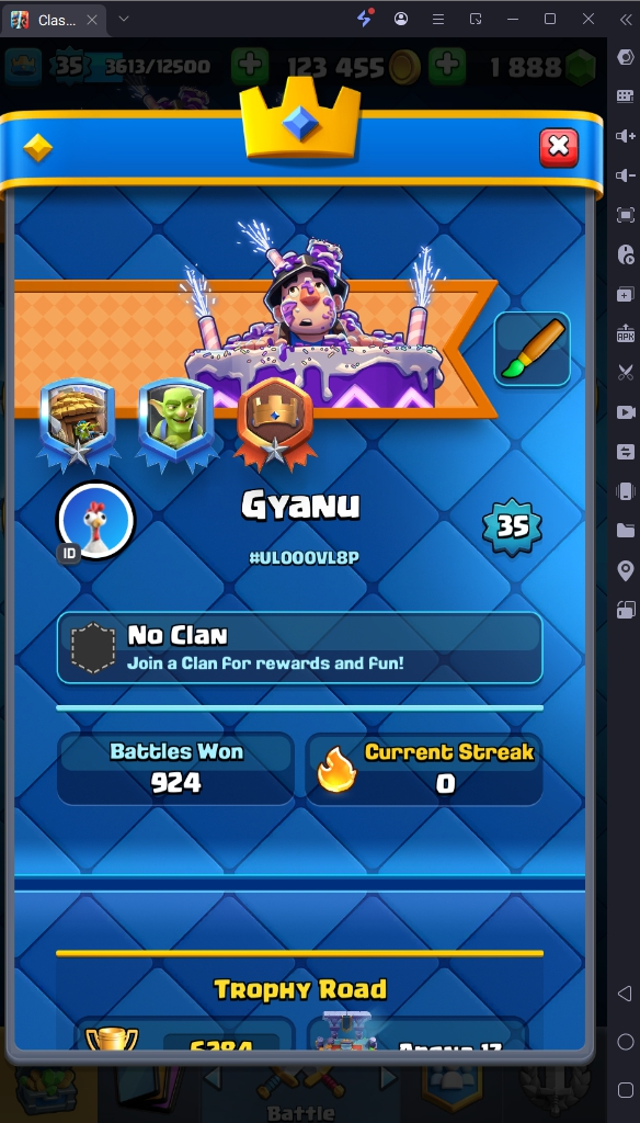 6284 TROPHY 🏆 35 LVL 💯 KT 12 👑 114 CARDS ♦️ 0 MAX CARDS 👑 0 ELITE CARDS 🔮 4 EVO 💯 EMOTE 20 🎭 #UL000VL8P ⸱ TAG ACCOUNT ♥️