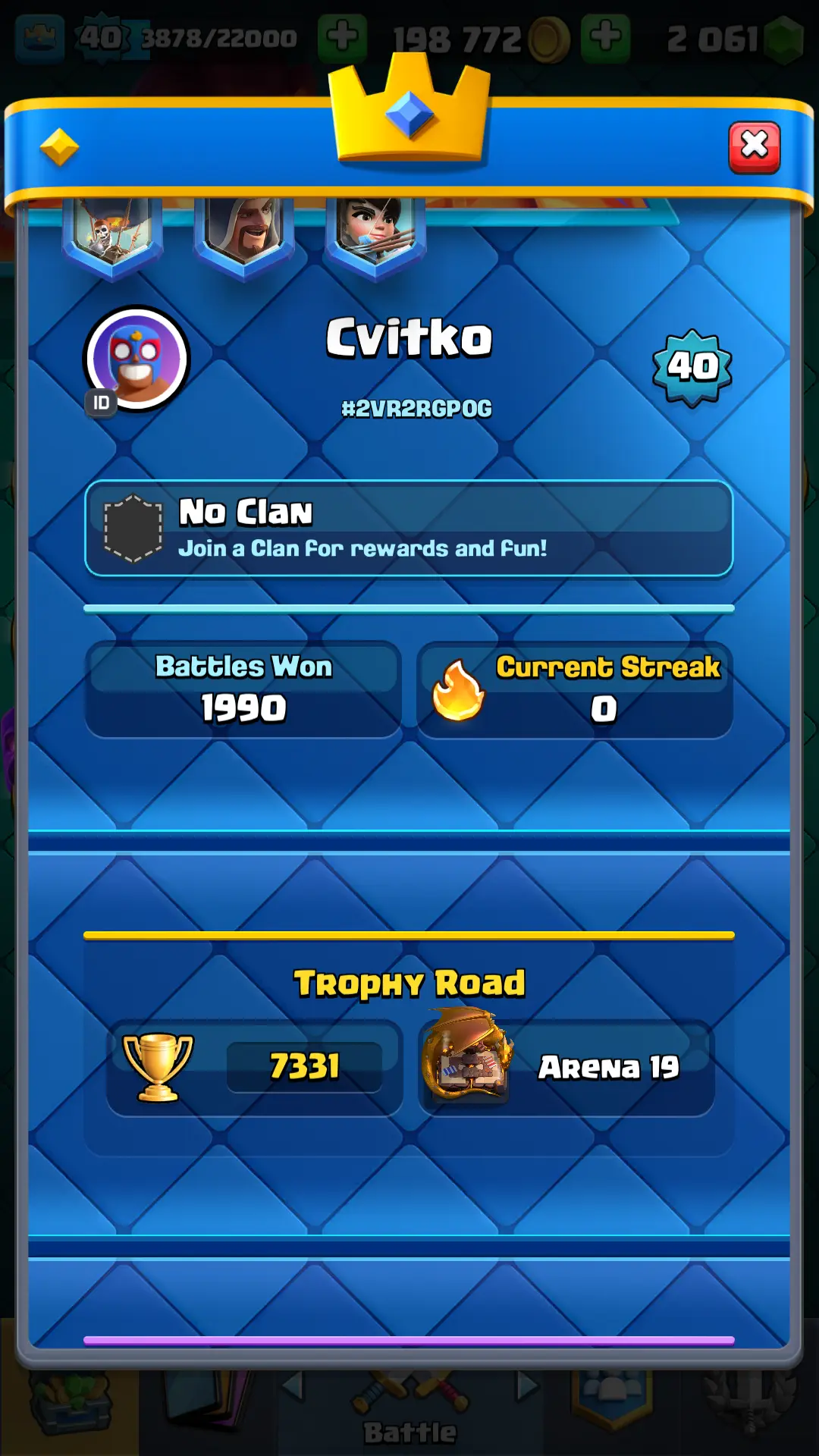 7331 TROPHY 🏆 13 KT 🚀 LVL 40 👑 115 CARDS 🍉 3 MAX CARDS 👑 0 ELITE CARDS ⚡ 10 EMOTE 🚀 EVO 0 🎭 #2VR2RGP0G ⸱ TAG ACCOUNT ♥️