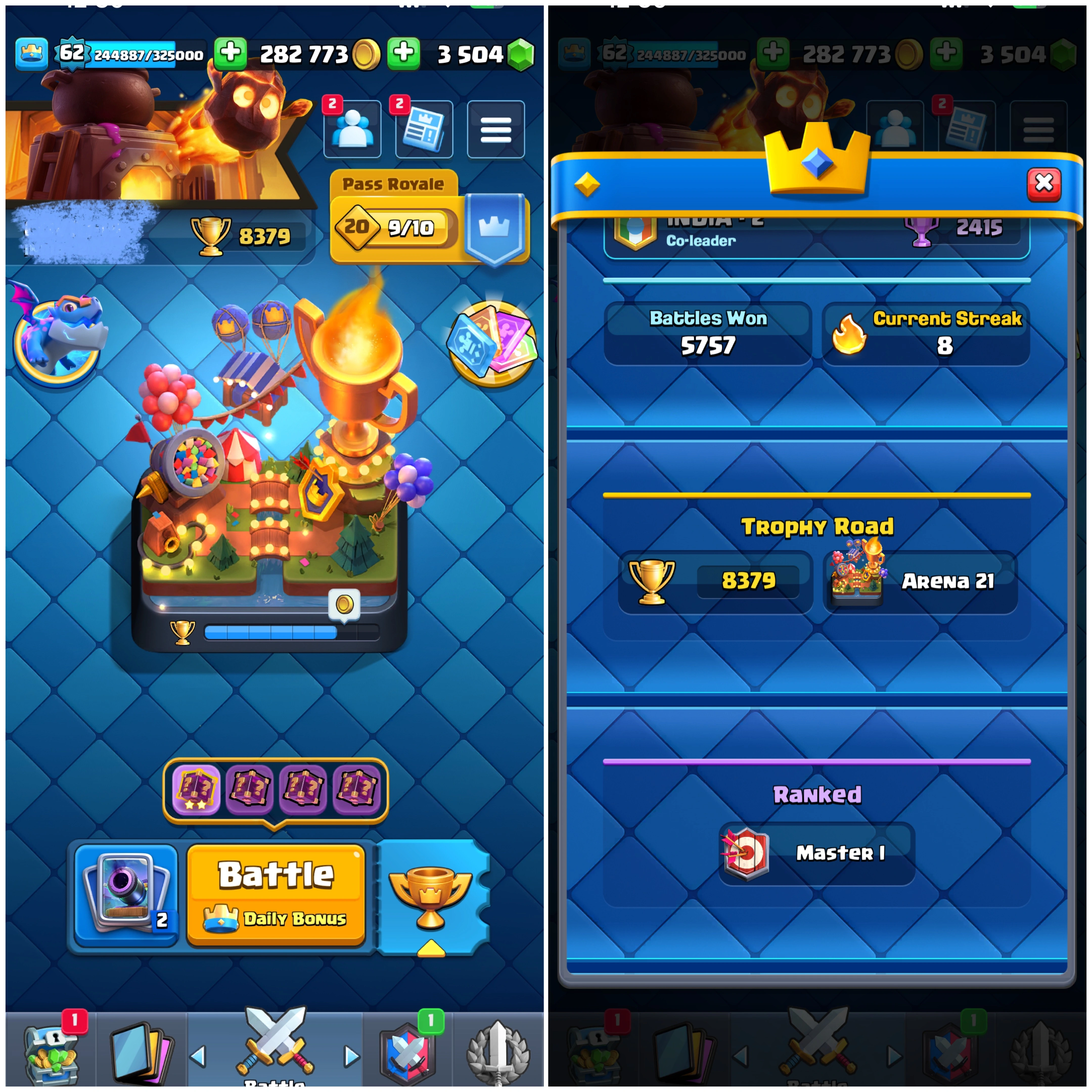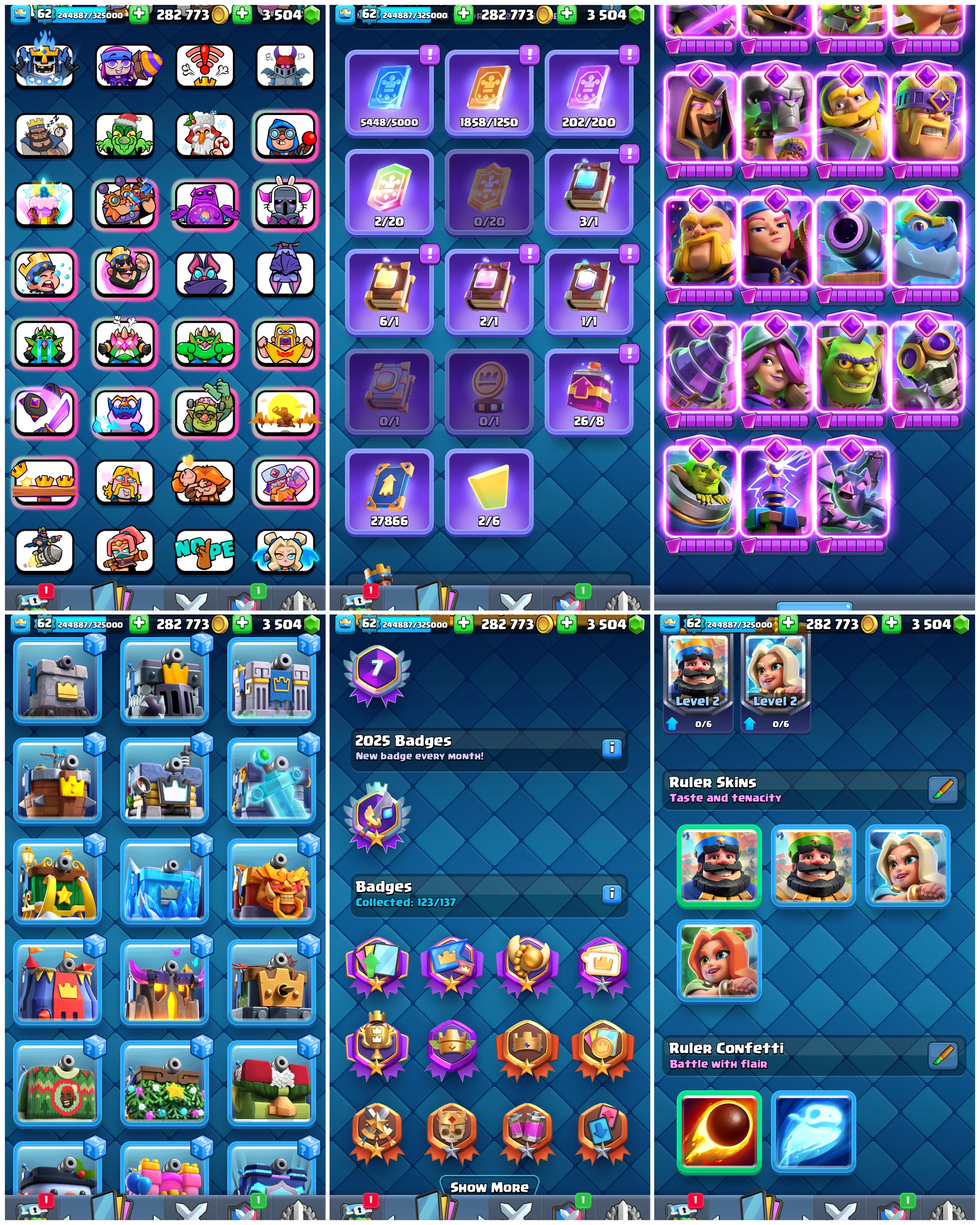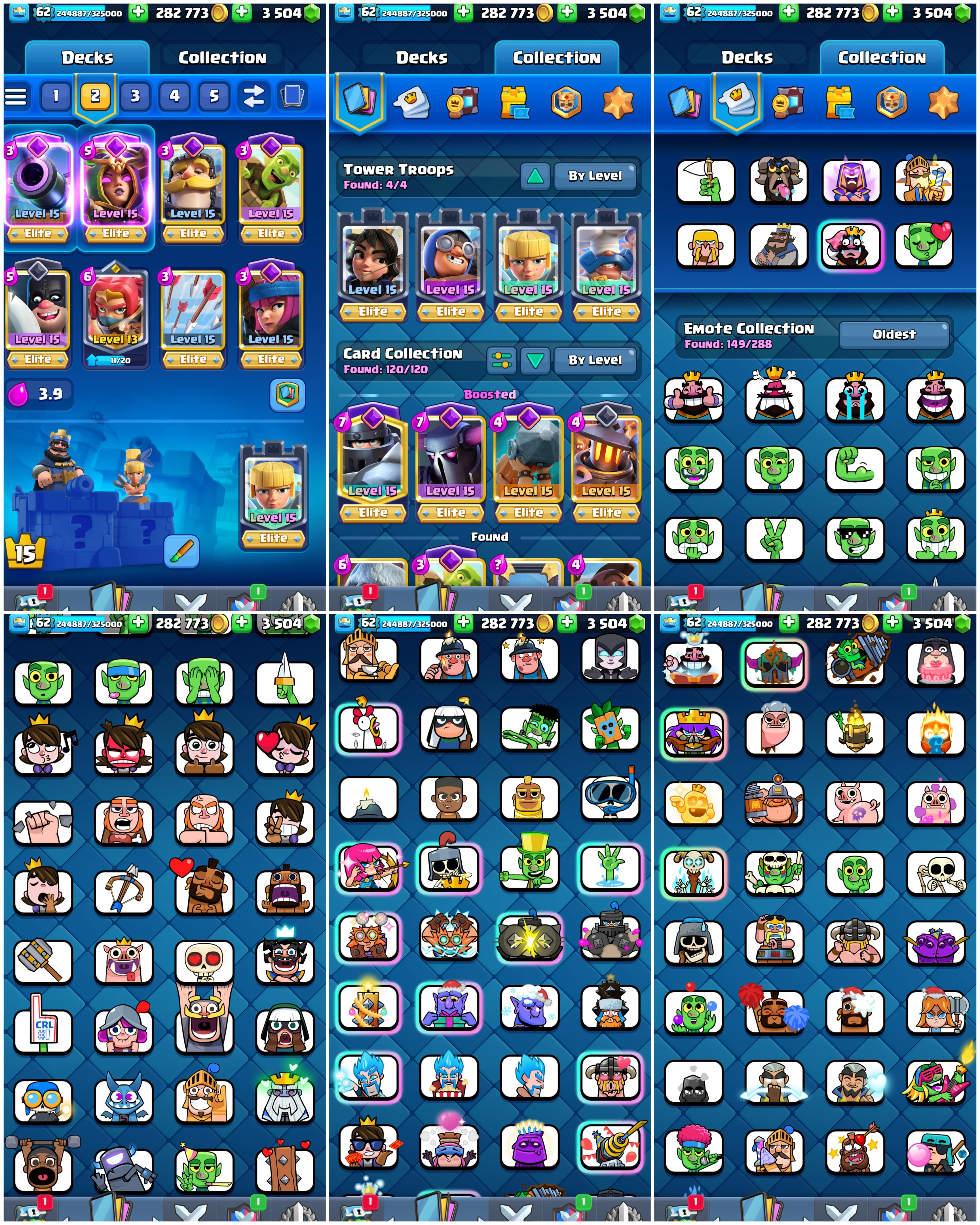 Only 1 Left Premium CR đ„ [Many Rare Emotes + Paid Tower Skins + Max-Level Cards] đ 8379 Trophies đ | Level 62 đ„ | King Tower 15 đ | Arena 21 âïž | Emote 149 đ Cards 120 đ„ Instant Delivery đ Lifetime Access â