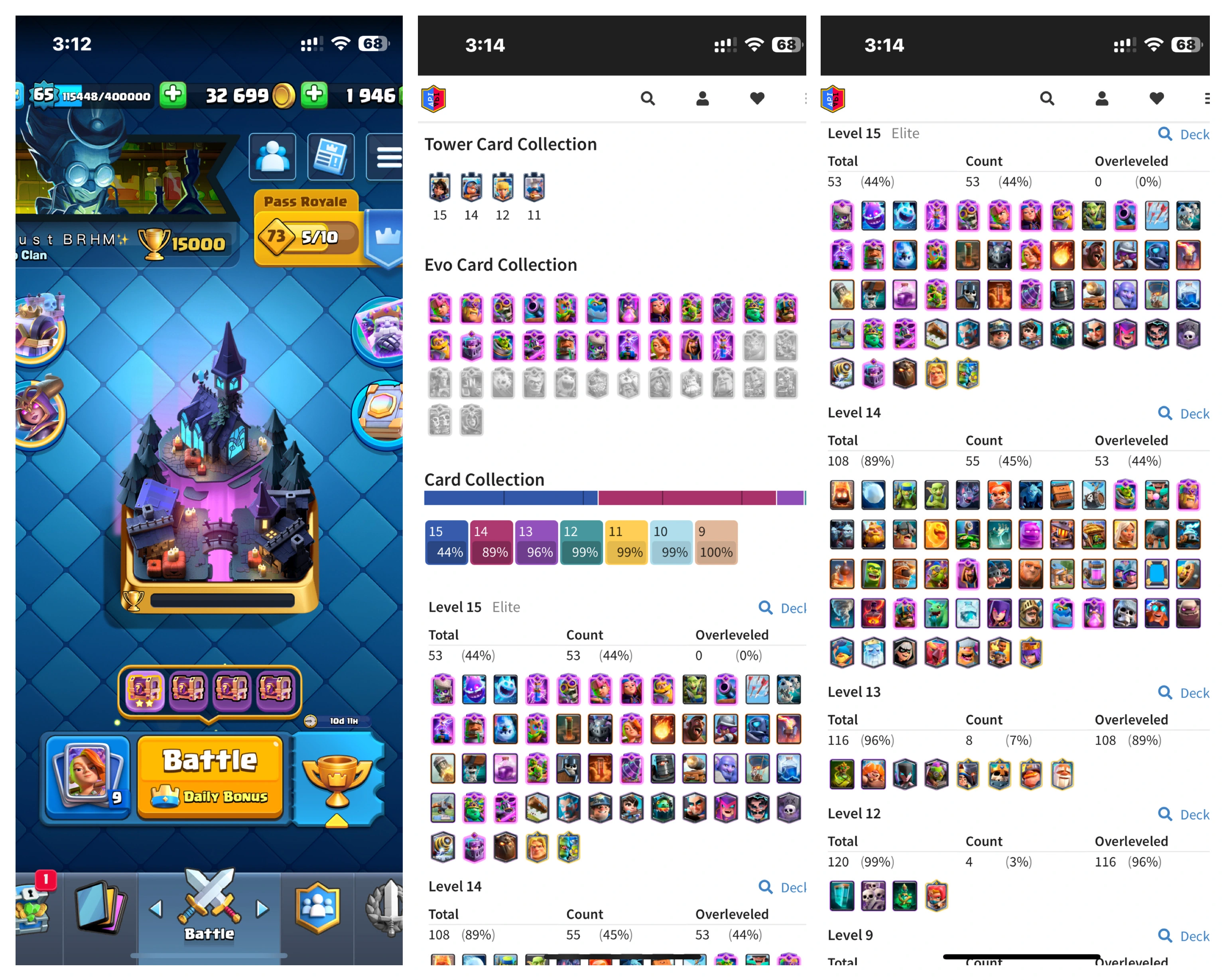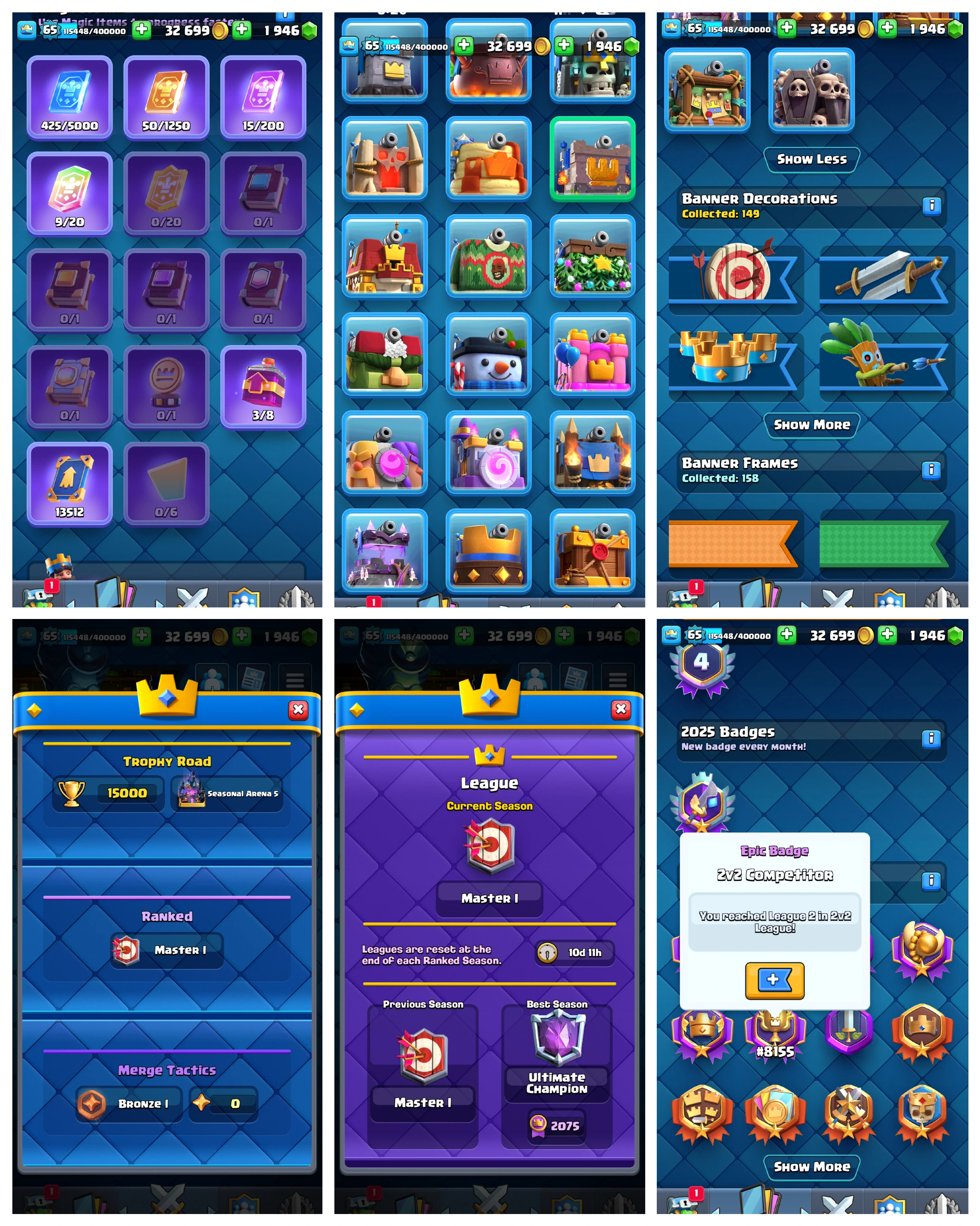 Premium KT 15 (LVL.65)✅ EVOS-22 ✅ 54 ELITE CARDS ✅ EMOTES-228 ✅ ULTIMATE CHAMPION 2075 ✅ 15K TROPHY ✅ 110 CARD MAX ✅ TOWER SKINS-20 ✅ ANDROID & IOS