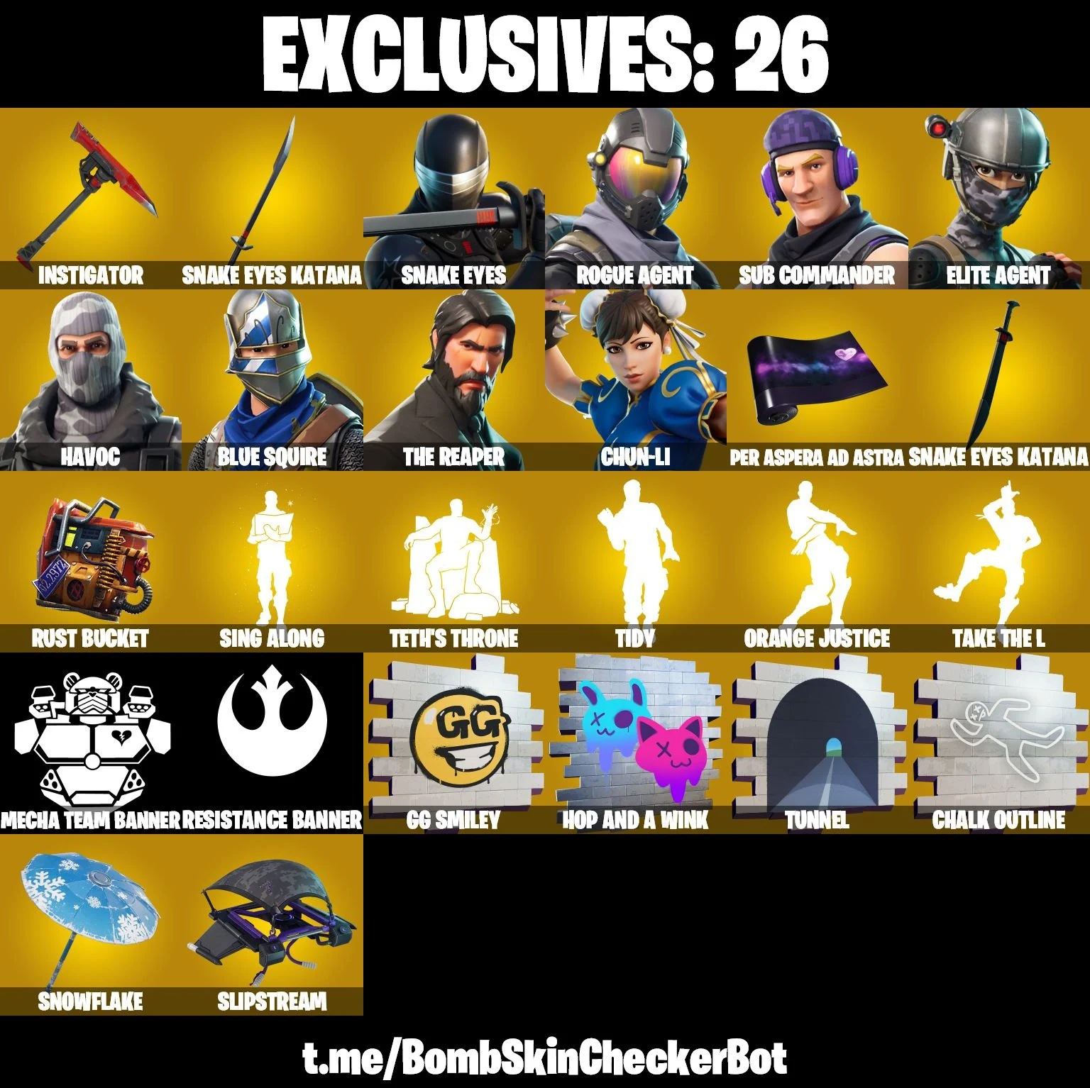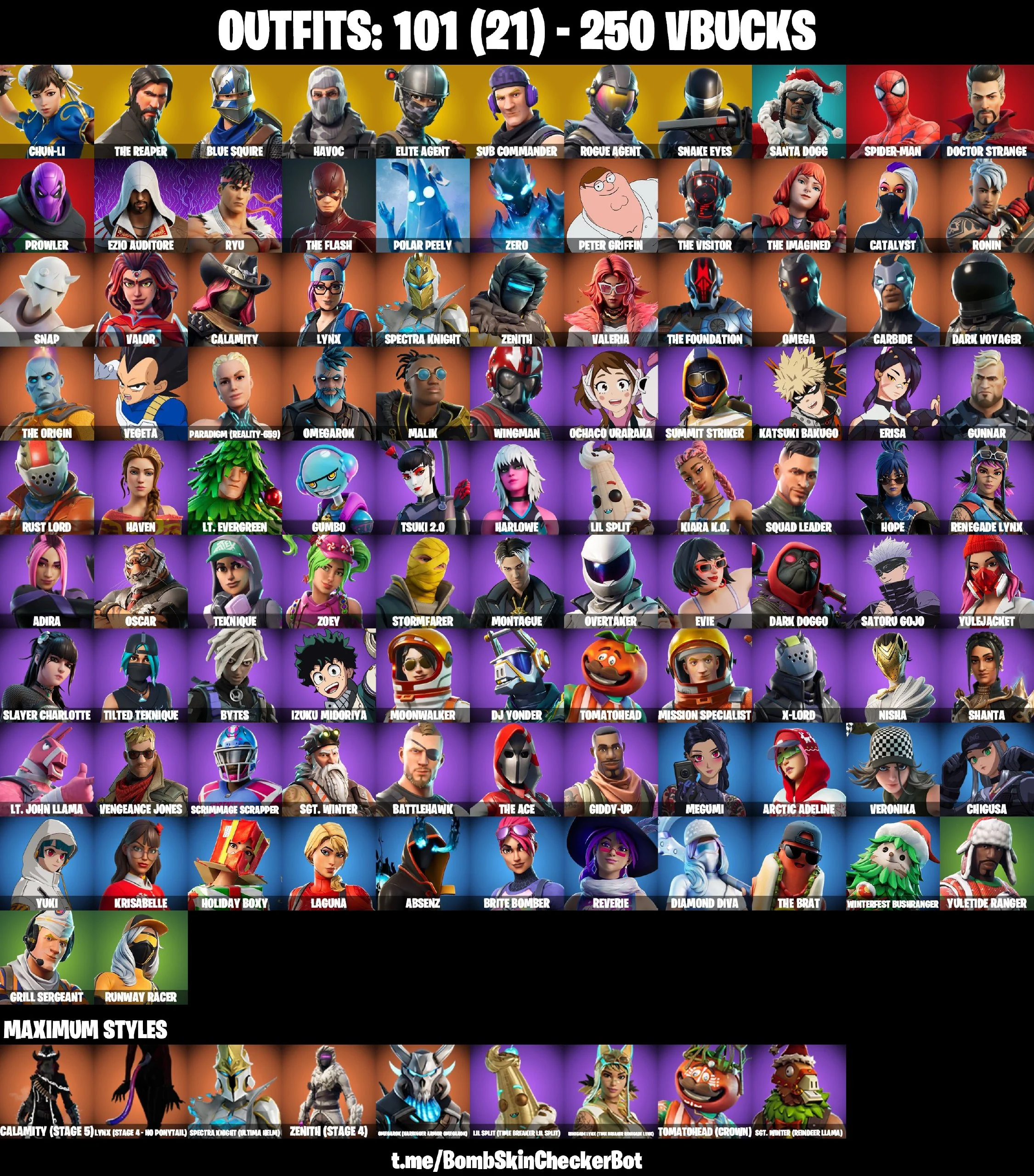 🔮101 Skins🔮 Chun Li💎Blue Squire💎The Reaper💎Take The L💎Ryu💎Rogue Agent💎Elite Agent💎Havoc💎Tidy💎Sub Commander💎Rust Bucket💎Izuku Midoriya💎Ochaco Uraraka💎Katsuki Bakugo