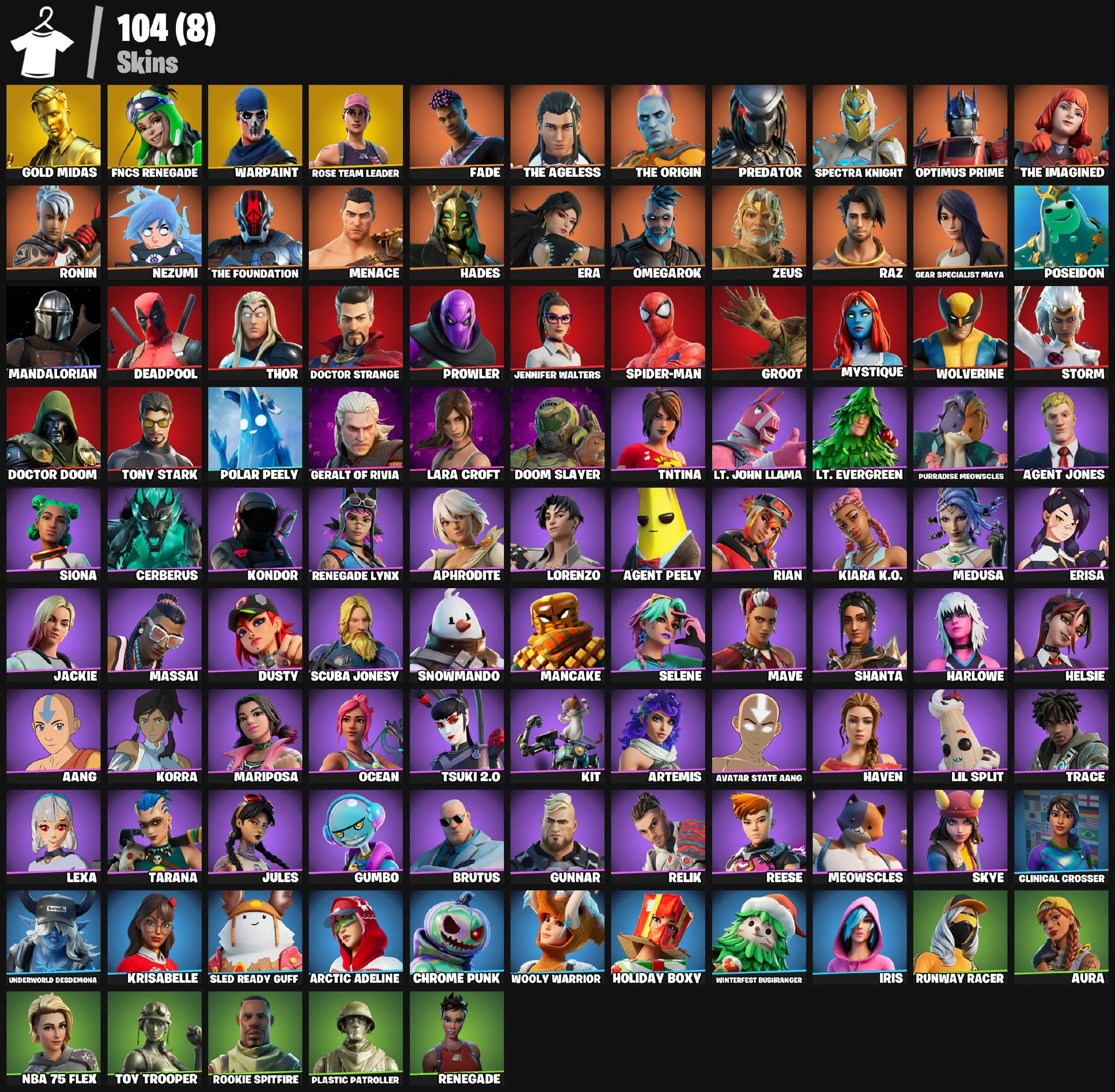 ă104 SKINSă (PC/XBOX) OG STW | AURA | DEADPOOL | IRIS | LARA CROFT | SPIDER-MAN | GERALT OF RIVIA | GOLD MIDAS | FNCS RENEGADE