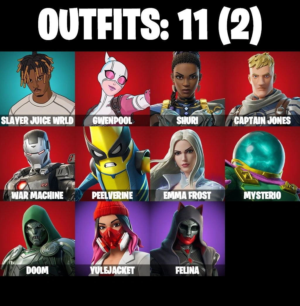 11 SKINS ⸱ GWENPOOL ⸱ SHURI ⸱ CAPTAIN JONES ⸱ WAR MACHINE ⸱ PEELVERINE ⸱ EMMA FROST ⸱ MYSTERIO ⸱ DOOM ⸱ YULEJACKET ⸱ FELINA