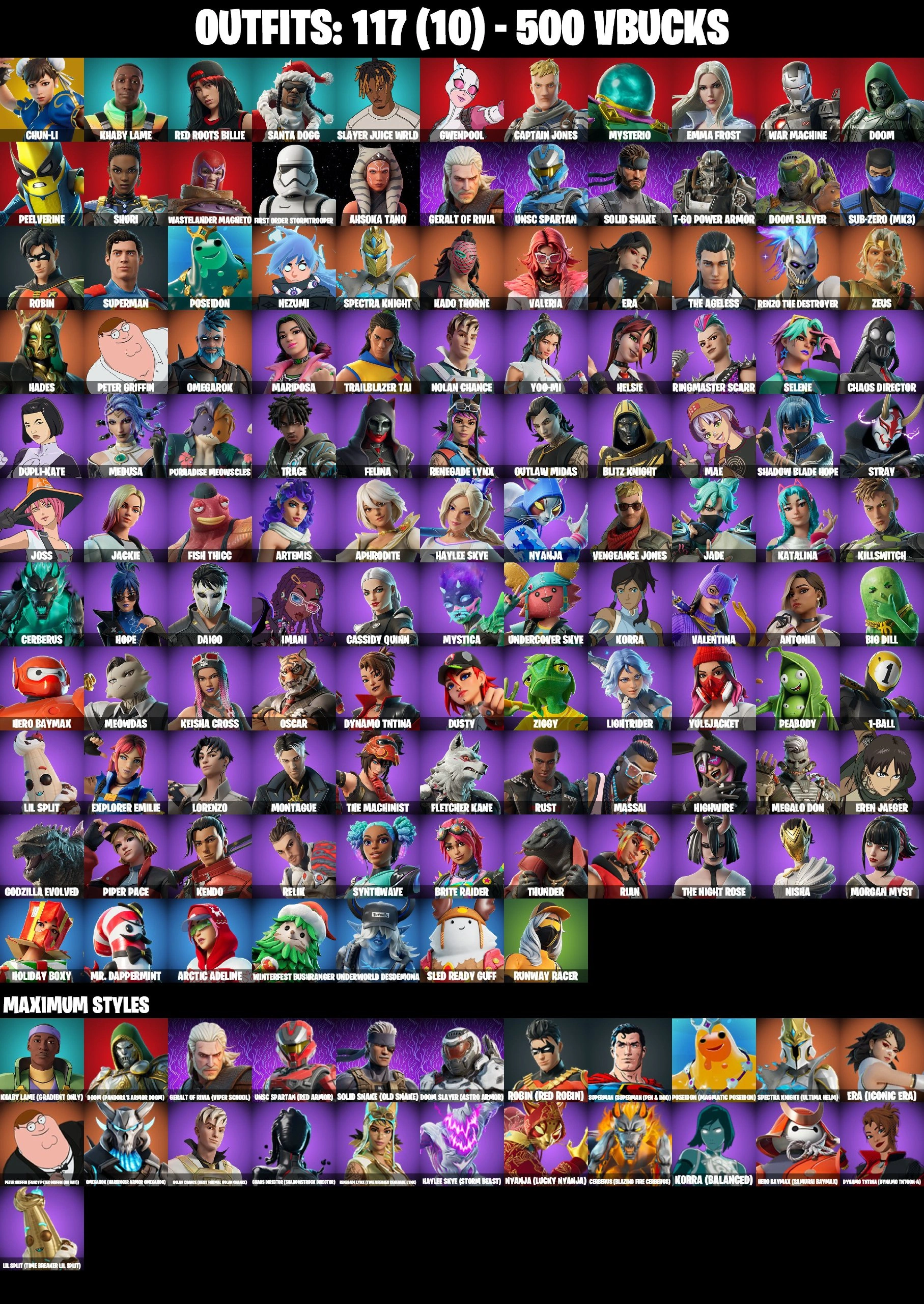 ❤️ 117 SKINS ❤️ CHUN-LI ❤️ OUTLAW MIDAS ❤️ SUB-ZERO MK3 ❤️ GET GRIDDY ❤️ FIRST ORDER STORMTROOPER ❤️ AHSOKA TANO ❤️ EREN JAEGER ❤️ ERA MAX ❤️ HAYLEE SKYE MAX ❤️ CHAOS DIRECTOR MAX ❤️ HELSIE ❤️ ARTEMIS ❤️ VALENTINA ❤️ DUPLI-KATE