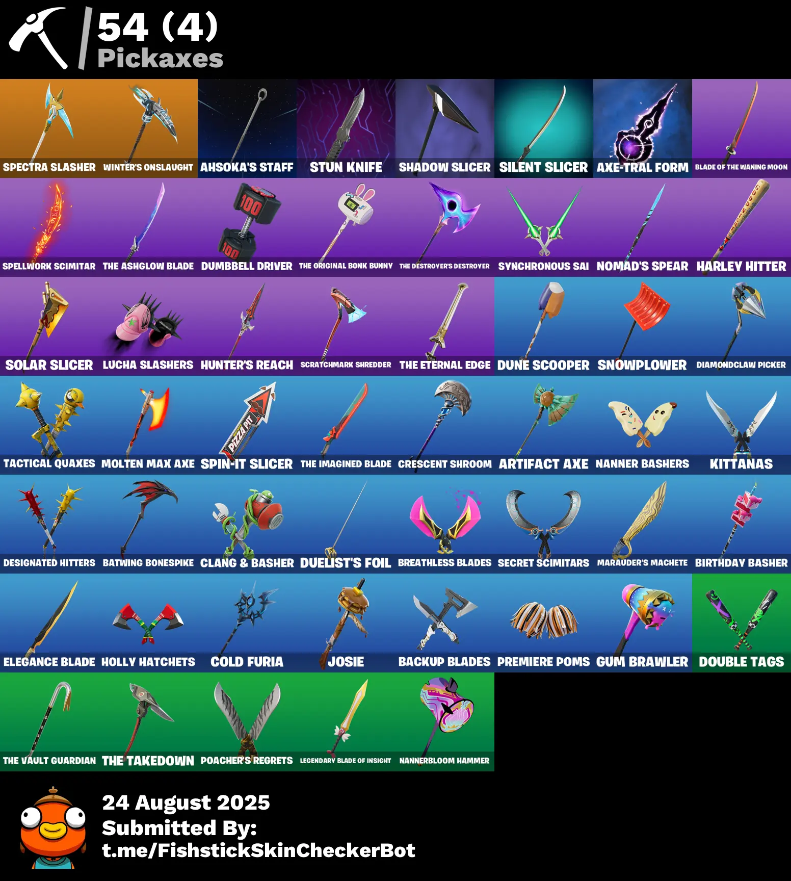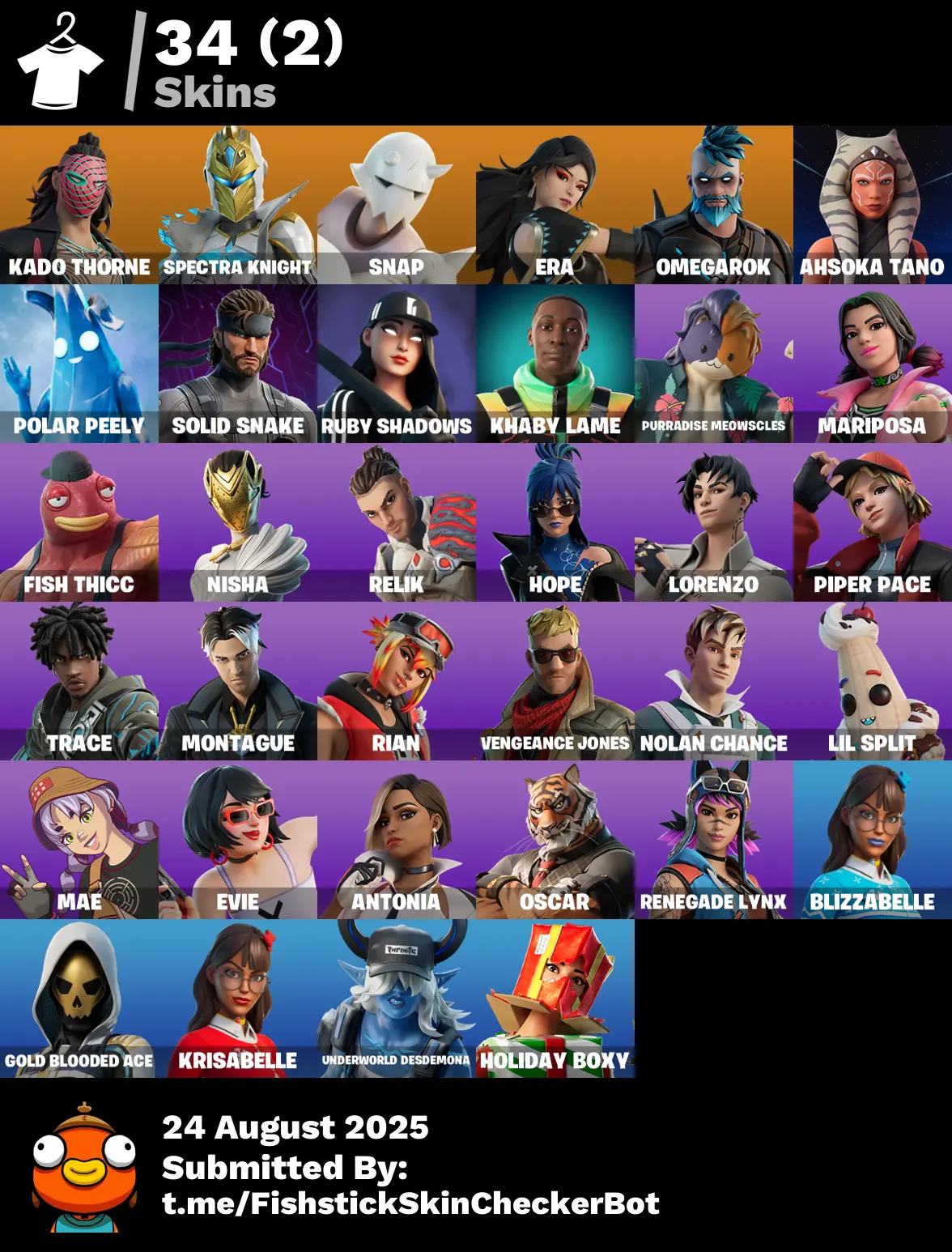 34 skins | Rebel Brella❄️Montague❄️Cold Furia❄️Nanner Bashers❄️Vengeance Jones❄️Ruby Shadows❄️The Destroyer's Destroyer❄️Crescent Shroom❄️Holiday Boxy❄️Designated Hitters❄️Nisha❄️Ahsoka's Staff❄️Spectra Knight❄️Nomad's Spear❄️Stun Knife❄️Solid Snake D4287