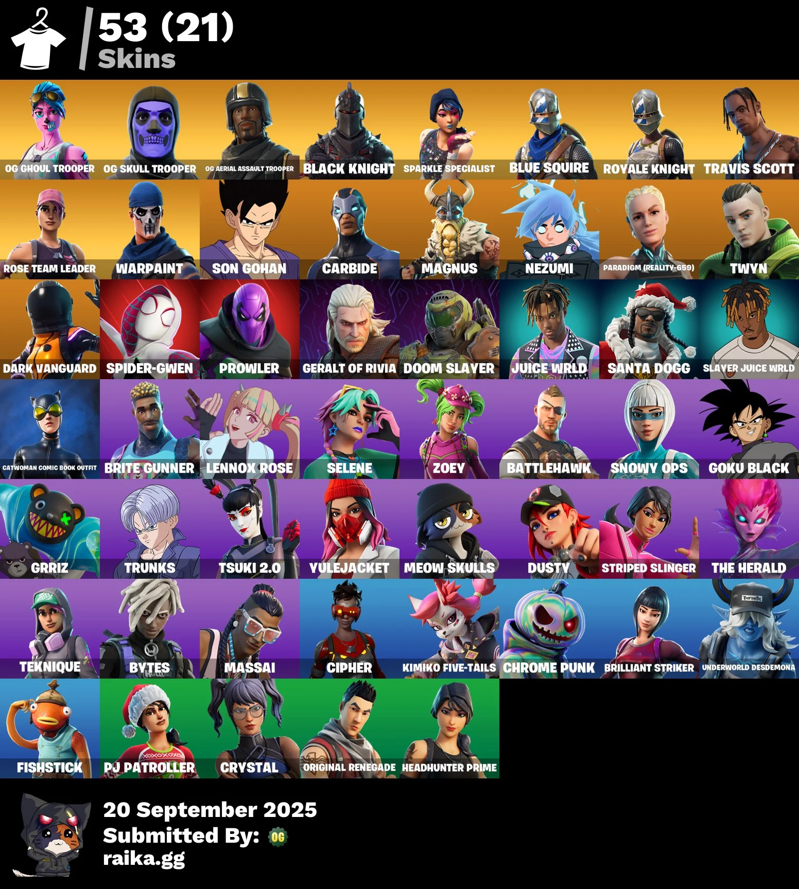53 skins | Og Skull Trooper🎃OG Aerial Assault TrooperOg Ghoul Trooper🎃Black Knight🎃Travis Scott🎃Sparkle Specialist🎃OG STW🎃Paradigm (Reality-659)🎃Prowler🎃Son Gohan🎃Twyn🎃Magnus🎃Doom Slaye🎃Blue Squire🎃Nezumi🎃Spider-Gwen D3034