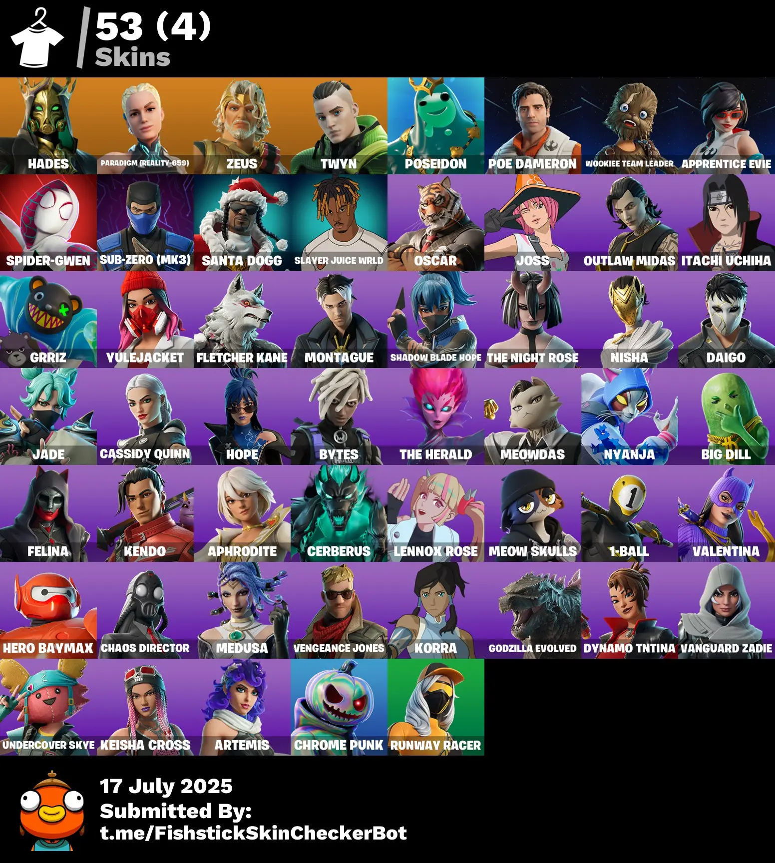 🦅 53 Skins [PC/PSN/XBOX] 🔥 Hades 💠 Paradigm ⚡ Zeus 🌪️ Twyn 🌊 Poseidon 🚀 Poe Dameron 🐾 Wookiee Team Leader 🌸 Apprentice Evie 🪄 FTN107