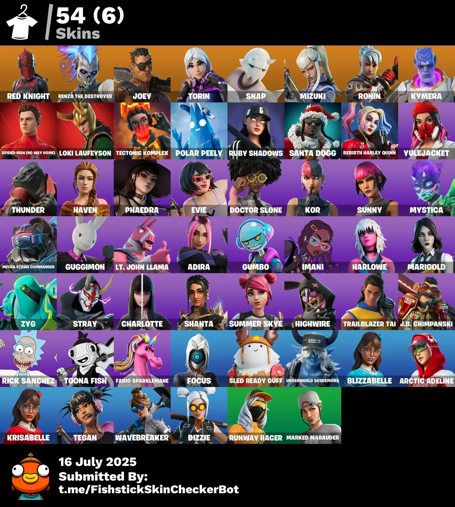 🐺 54 Skins [PC/PSN/XBOX] 🔴 Red Knight 💥 Renzo the Destroyer 👽 Joey 🧙 Torin 🌊 Mizuki ⚔️ Ronin 🪐 Kymera 🕸️ Spider-Man (No Way Home) 🪄 FTN95