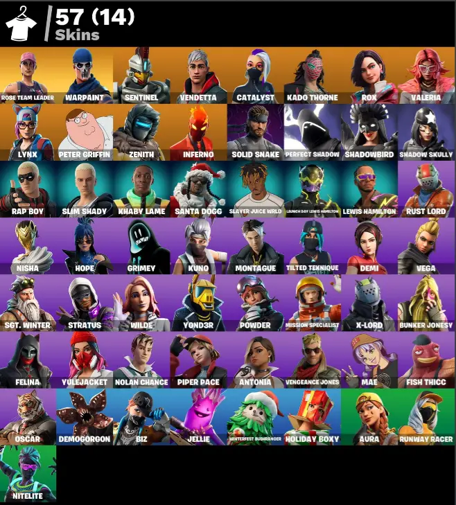 57 SKINS ⸱ OG STW, For all platforms, Vendetta (stage5), Warpaint, Lynx, Catalyst, Demi, Felina, Slim Shady, Launch Day Lewis Hamilton, Slayer Juice WRLD, Grimey, Biz, Solid Snake, Biz, Orange Justice